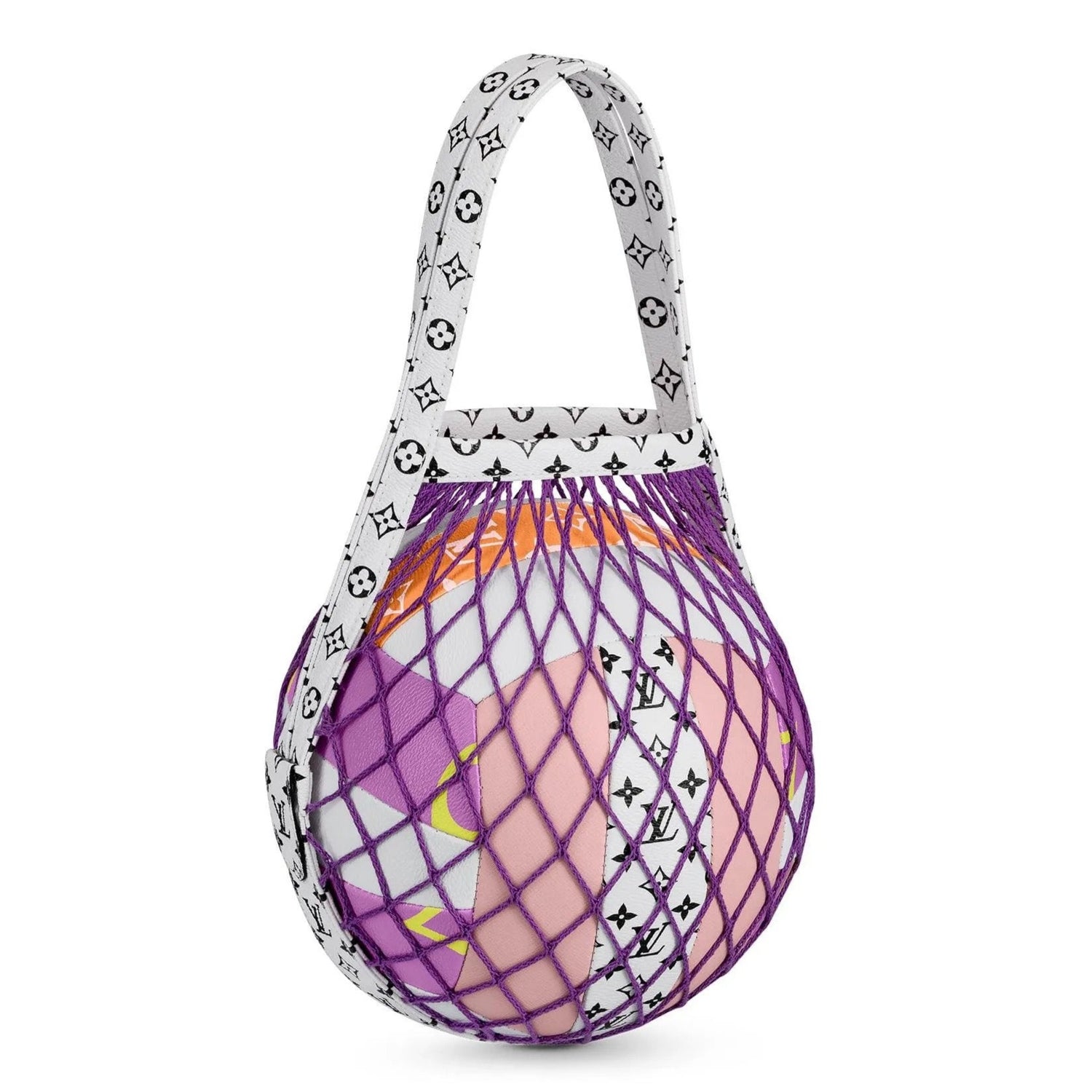 This design incorporates both larger and miniature LV monogram patterns for a dynamic look. It comes with a convenient net bag for easy transportation. The purple mesh body is secured to a monogram leather handle in black and white, providing a durable and stylish carrying option.