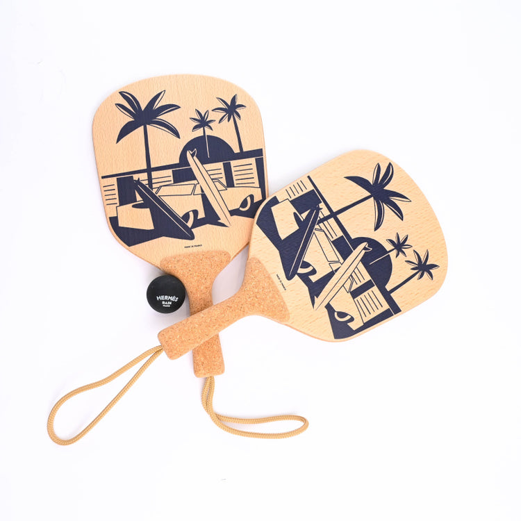 Set of two Après la Vague beach rackets in printed beechwood and cork.