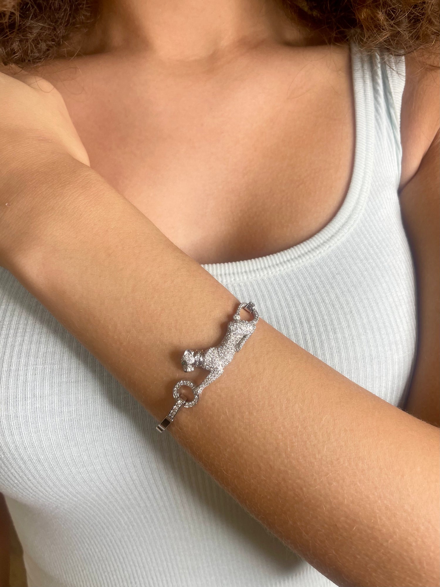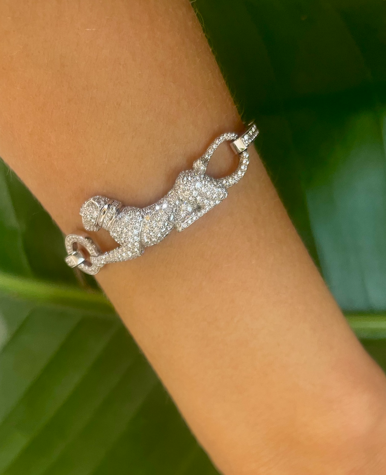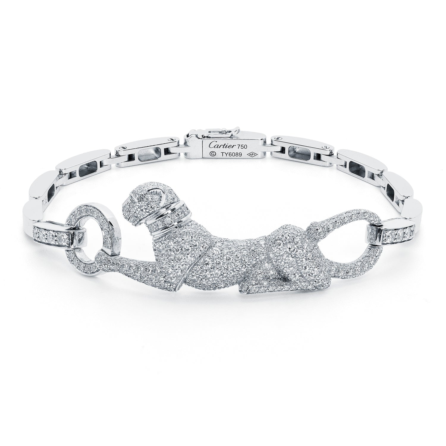 An iconic white gold Panthère bracelet designed by Maison Cartier features articulated domed links and is centred with a small elongated panther paved with diamonds. As a collector's piece, every bracelet is signed and numbered by Cartier. The bracelet is crafted with 750 white gold and paved with 18K diamonds.