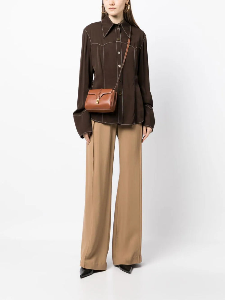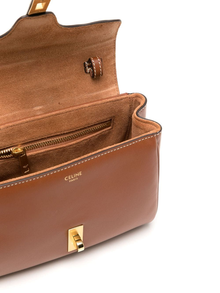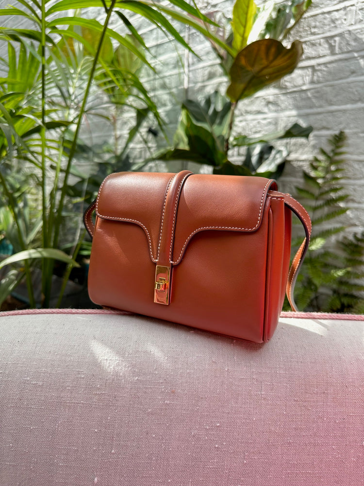 This Mini 16 bag from Celine is the epitome of quiet luxury. Crafted from CALFSKIN leather with lambskin lining and gold finishing, it is designed with versatility in mind. Features include a turn-lock closure, two main compartments, one inner flat pocket and one inner zipped pocket, as well as one outer flat pocket on the front under the flap. Carry it by hand, over the shoulder or cross-body with the removable leather strap.