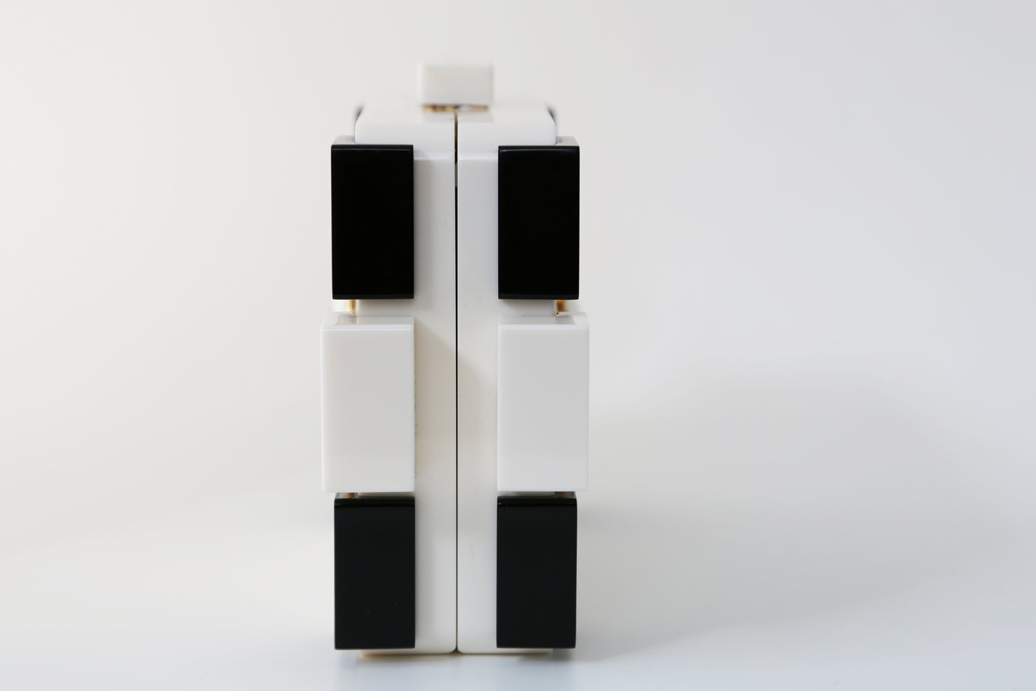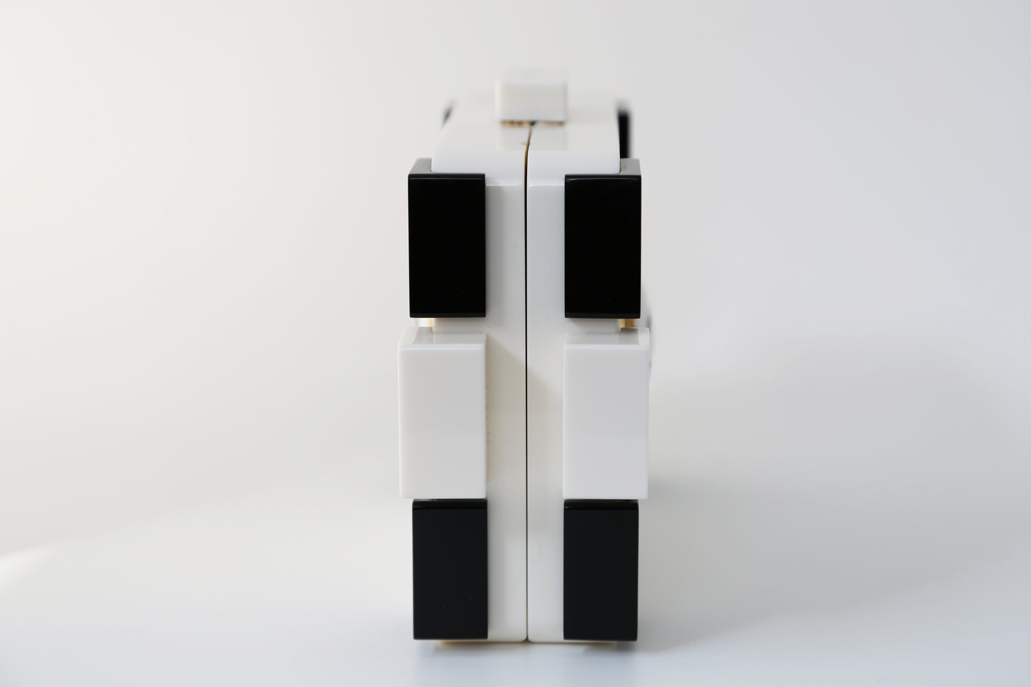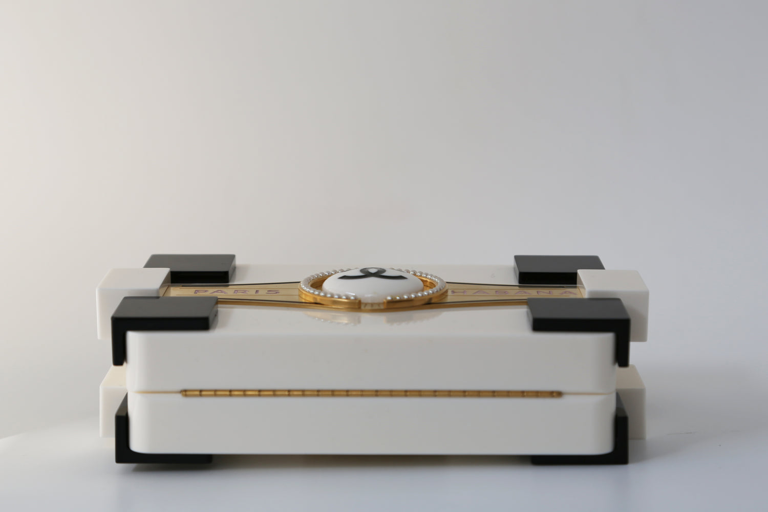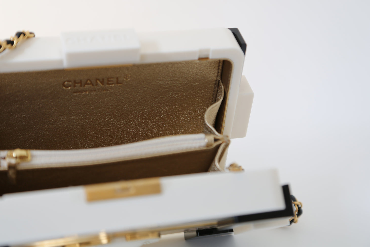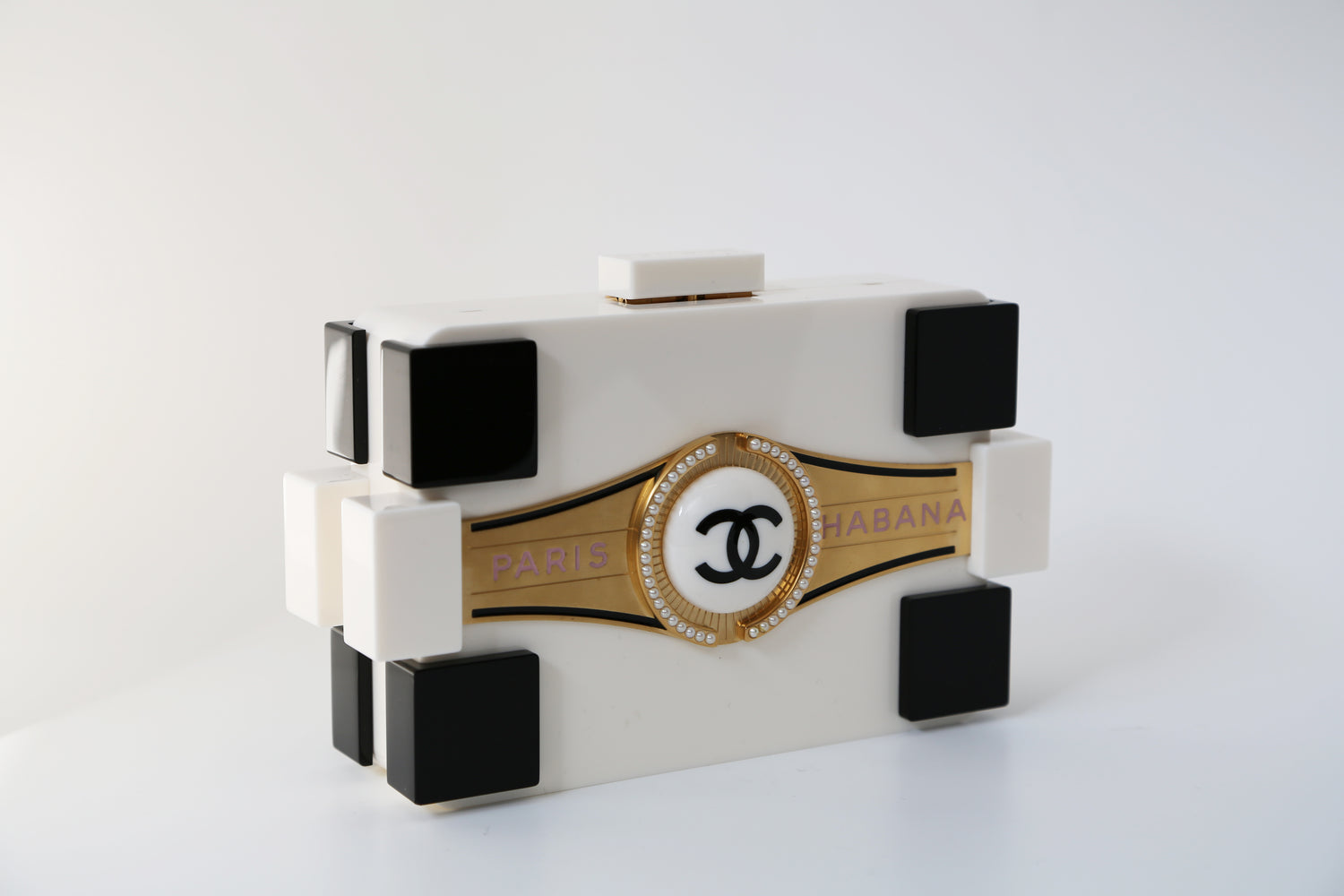 Karl Lagerfeld's lasting impact on fashion shines in this collector's edition clutch from his final runway show. Inspired by Cuba, the bag features a cigar-box design, a lucite Lego Boy Brick shape, and elegant gold and pearl details. The versatile style can be worn as a classic clutch or with the leather shoulder strap.