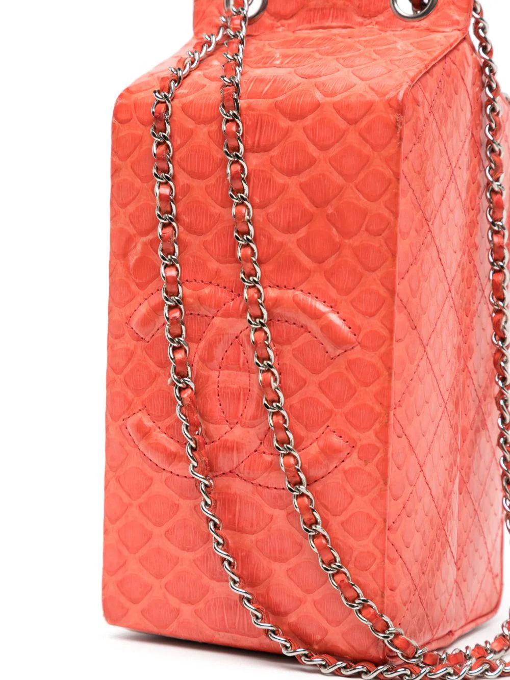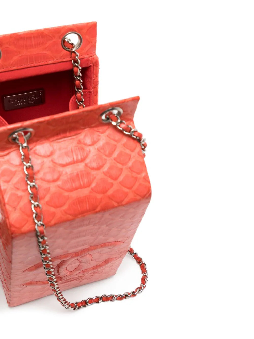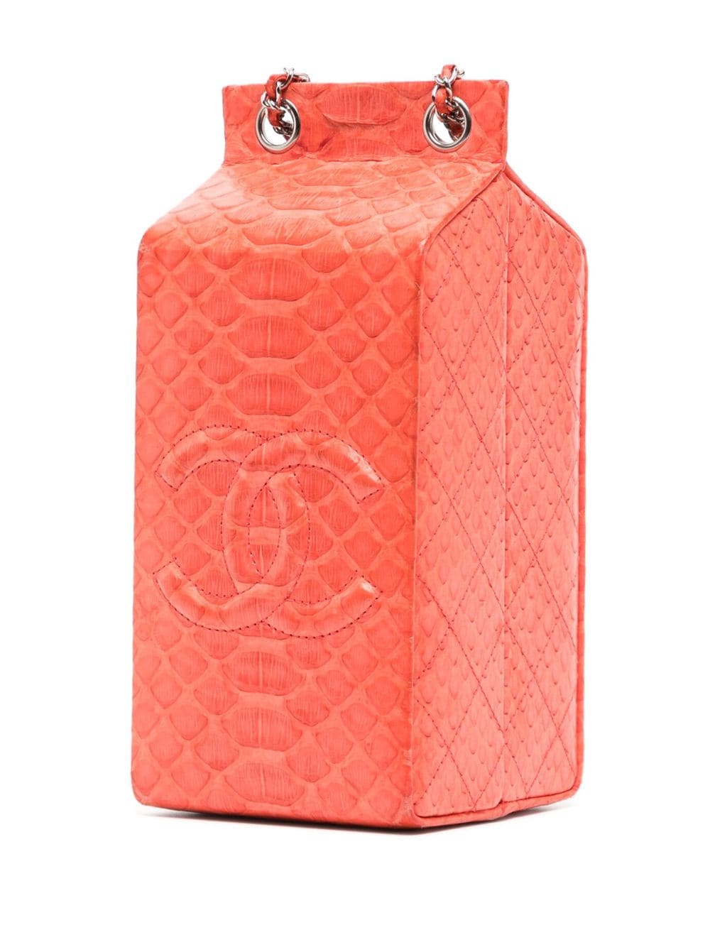 First seen in Chanel's Autumn/Winter 2014 runway Collection, inspired by the supermarket, the Lait de Coco minaudière is an exemplary collectors item. For this collection, Karl Lagerfeld transformed everyday items into beautifully crafted accessories, notably with this Chanel milk carton bag. This whimsical shoulder bag is designed in the shape of a milk carton, crafted from luxurious leather with the iconic double CC logo. The interior features an inner leather lining and chain-link shoulder strap.