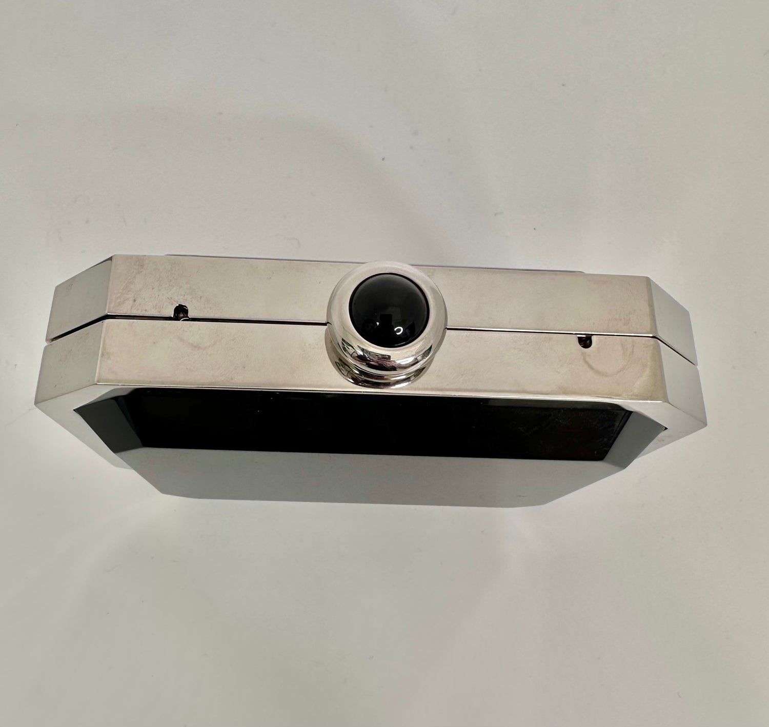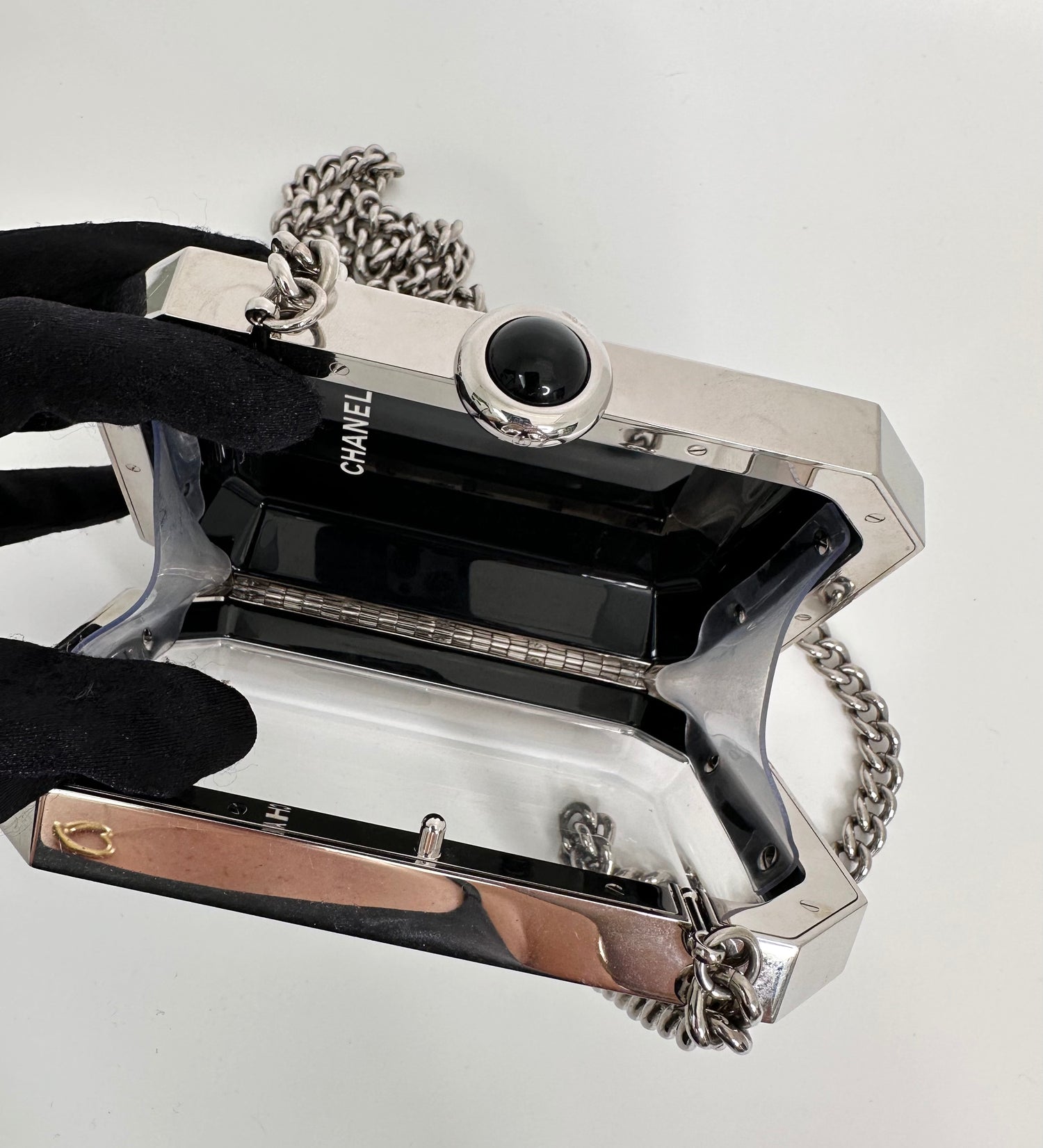 This vintage Chanel clutch with chain bag minaudière has been crafted from mirrored hardware in sleek style lines. Panelled with plexiglass, one side is glossy black and the other is transparent - you can even see a Chanel logo through the window. It's topped with a 'CC'-embossed push-clasp, and has an optional curb-chain shoulder strap. Be sure to carry the prettiest essentials when wearing this playful black mini shoulder bag - think smartphone, card holder, and a Chanel lipgloss.