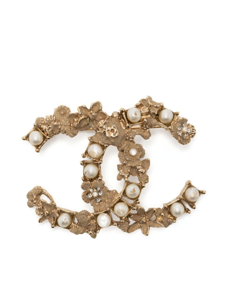 Coco Chanel had a great fondness for pearls and considered them her favourite adornment for jewellery. She preferred asymmetrical polished white or ivory-hued pearls and believed that the more pearls, the better. This silver-plated brooch, which features the iconic interlocking CC logo, is a prime example of her vision. It is adorned with polished faux pearls and clear crystals and adds an elegant touch to any outfit.