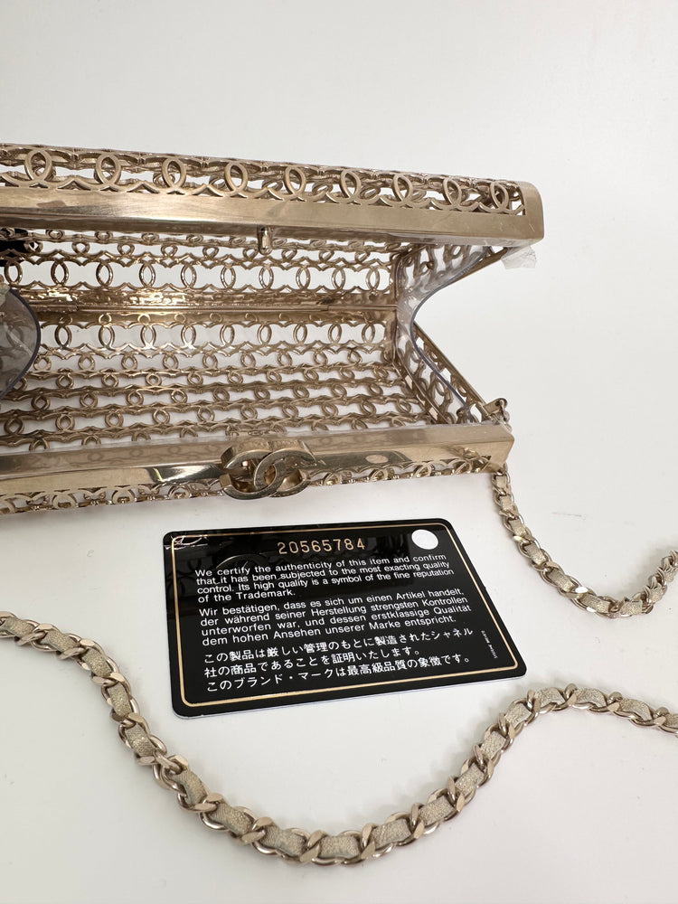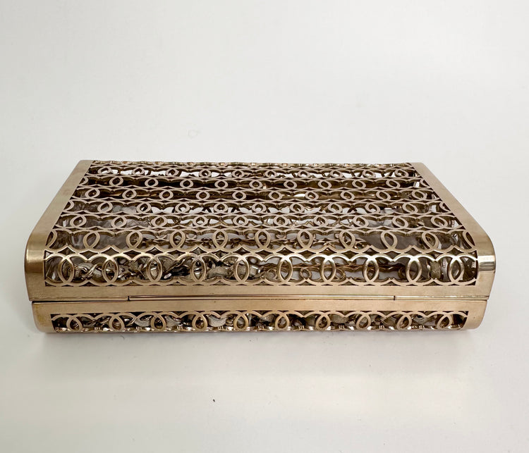 This rare Paris-Dubai Runway Champagne CC Minaudiere is one of the pieces featured on the runway of Chanel Cruise 2015. The collection evoked Middle-Eastern folk stories Arabian Nights and Aladdin with the use of patterns and heavy embellishments.