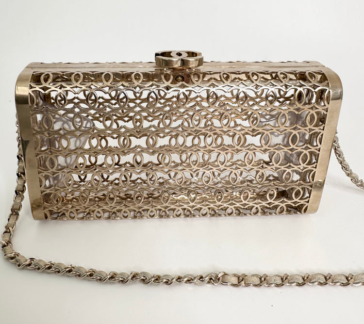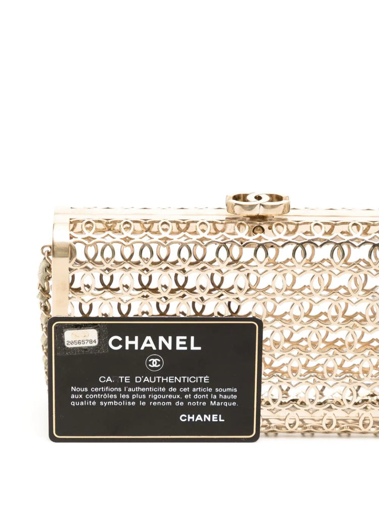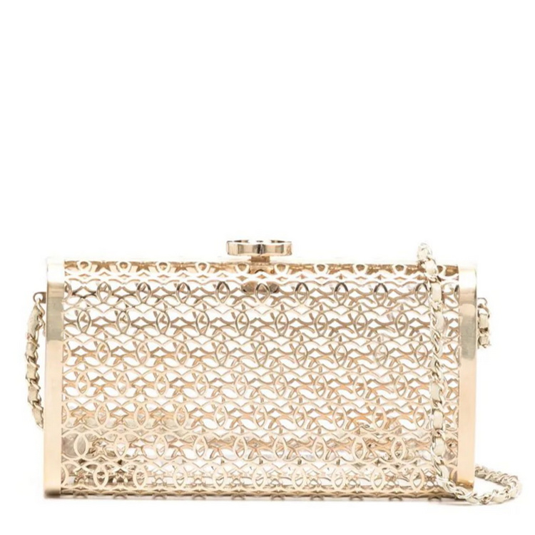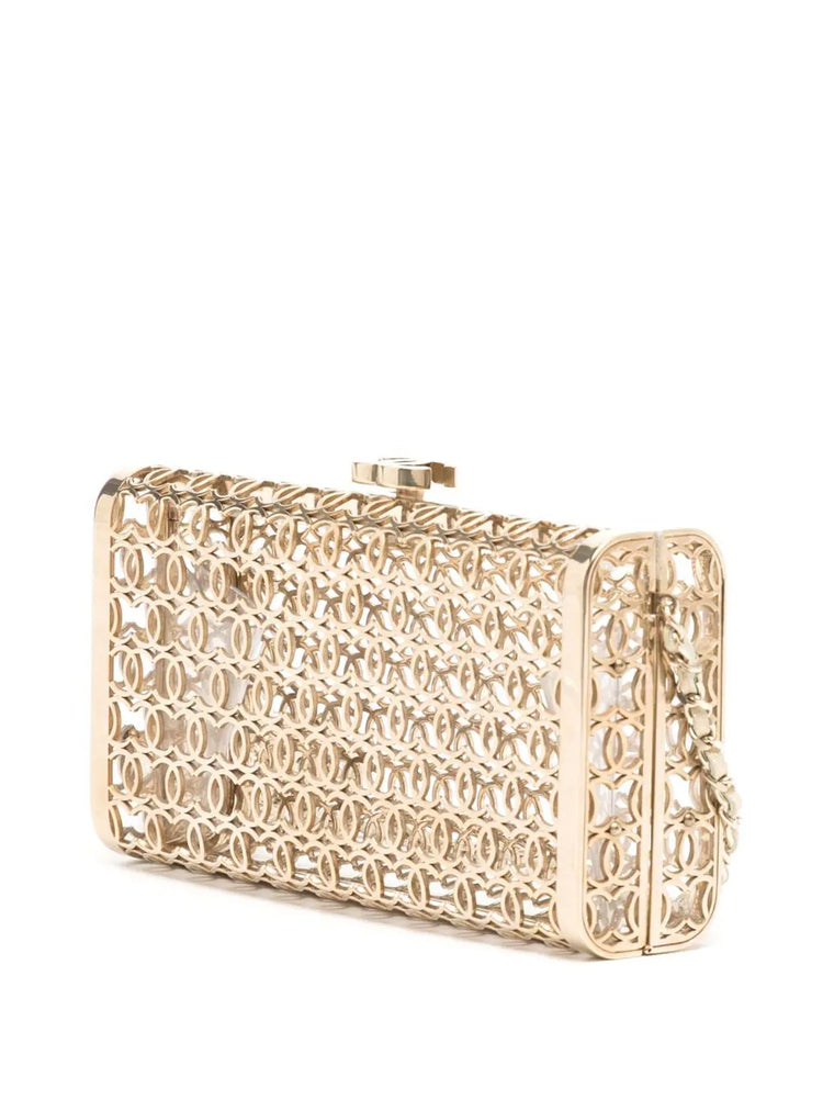 Inspired by the Moucharabieh carved lattice windows typical in Arabic architecture throughout the Middle Ages, the minaudiere features a metal interlocking CC logo pattern, cut-out detailing, clasp fastening and leather and chain-link shoulder strap.
