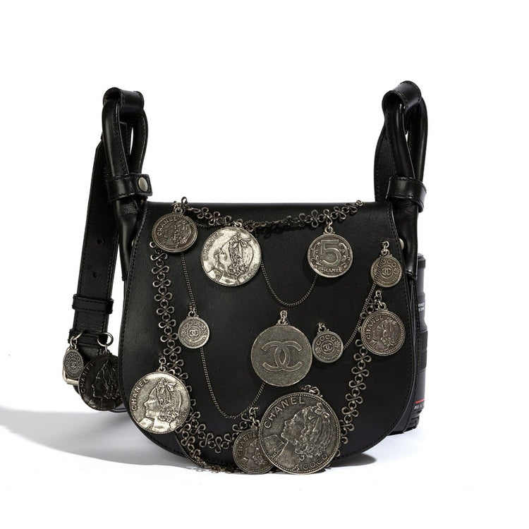 Crafted in Italy, this extremely rare and highly sought-after bag from the Chanel Spring 2003 Runway Collection showcases a black leather exterior, a structured saddle bag design, and a distinctive front flap that is adorned with ruthenium-draped chains and decoratively hanging antique medallion coins, which are embellished with the iconic interlocking CC logo for a modern touch. A fold-over top opens with a belted closure and concealed snap fastening to reveal a spacious interior compartment with room for all your Chanel essentials, making it perfect for any collector looking for that one-of-a kind piece. This versatile piece can be carried over the shoulder or alternatively as a crossbody using the adjustable leather strap, which is also adorned with decorative antique medallion coins.