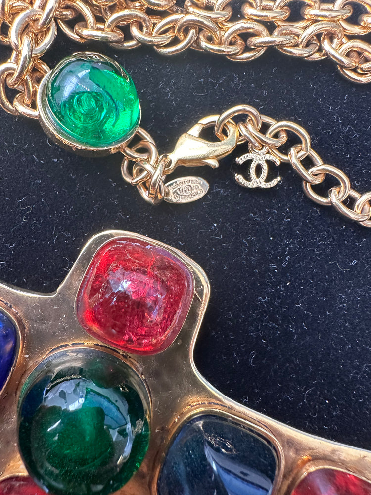 Designed with a large cross motif, this pre-owned vintage Chanel necklace displays red, green and blue cabochons hanging from a gold-toned double chain. The large cross motif has been finished with 4 additional smaller chains with faux pearl detailing. Secured using a lobster claw clasp which can be adjusted to your desired length, style this XL piece with something dainty or gold.