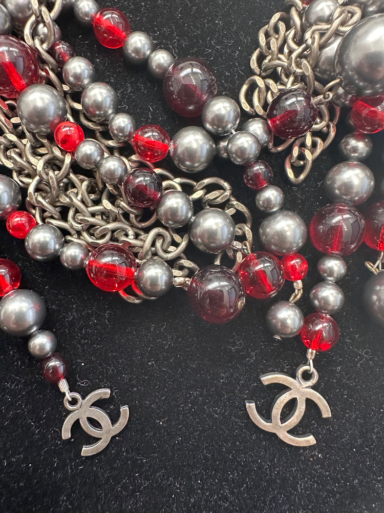 This stunning pre-owned Chanel chunky necklace features gunmetal grey, red and black beads finished with CC logo accents. Hanging around your neck, the detailing falls beautifully across your chest for a sophisticated and elegant look. The perfect addition to dress up any outfit, pair this necklace with your favourite silver jewellery for a truly luxurious look.