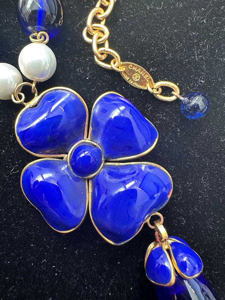 Gripoix jewellery is glass jewellery that is made by hand. From Chanel, comes this Gripoix vintage necklace that features a strand of gold-toned chains with a statement blue Camelia flower, and several more flower motifs on a beaded chain. The piece is finished with an adjustable fastening, that allows you to get the perfect drop.