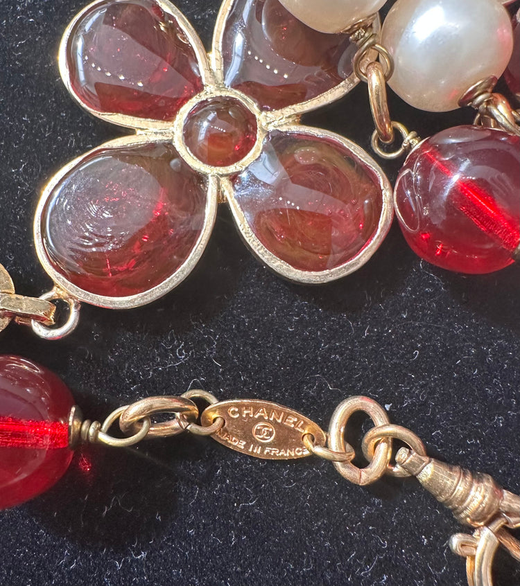 Gripoix jewellery is glass jewellery that is made by hand. From Chanel, comes this Gripoix vintage gold-plated layered necklace featuring an elegant faux-pearl detailing, and red-hued glass beads to create a floral motif.