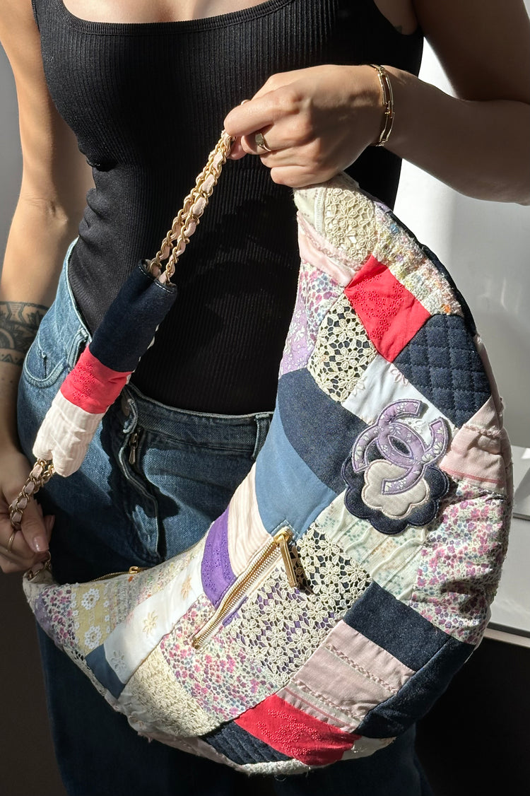 Discover the perfect blend of style and functionality with the Hobo Patchwork Multi Crossbody Bag from Chanel. Made of durable cotton, this bag features a unique and eye-catching patchwork design. The crossbody strap provides comfort and versatility, making it the perfect accessory for any occasion.