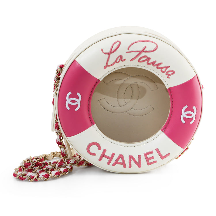 Part of the 2019 Chanel Cruise "La Pausa" Collection, this pre-owned nautical themed "La Pausa" Cruise 2019 Shoulder Bag is also nicknamed the ""Lifesaver"" bag and was released in very limited quantities. Made of smooth lambskin, this bag features a see-through middle to reveal an oversized logo on its interior. The bag also features a double zip closure for extra convenience and storage of important essentials.
