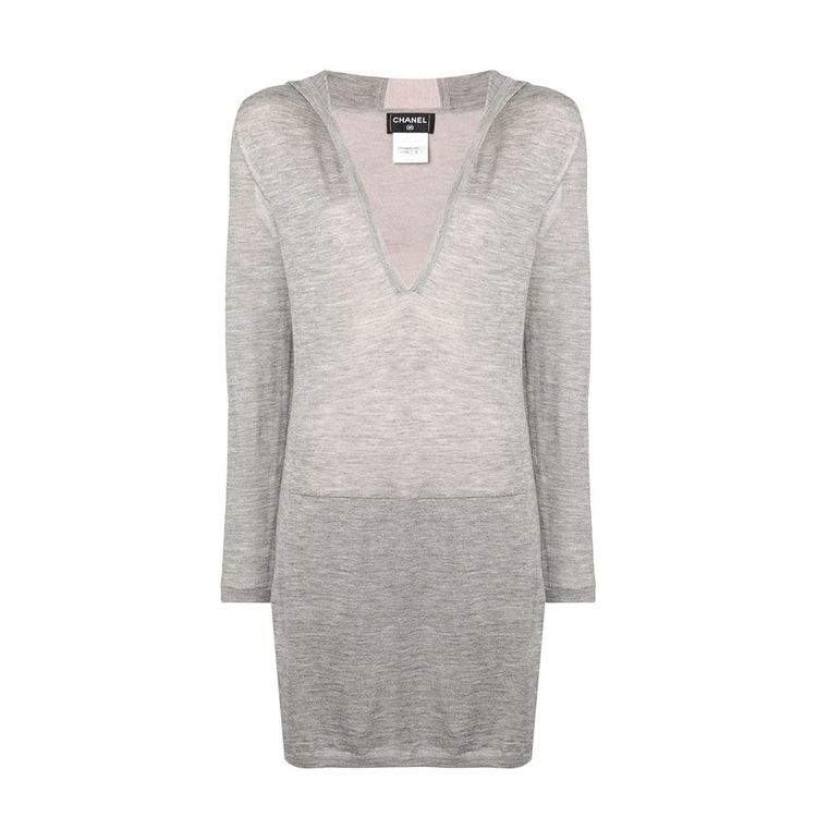Equal parts effortless and alluring, this cosy, preloved lounge top by Chanel is crafted in Italy from a soft blend of light grey cashmere and silk. It features long sleeves, a long length, a deep V neck, and a hooded design.