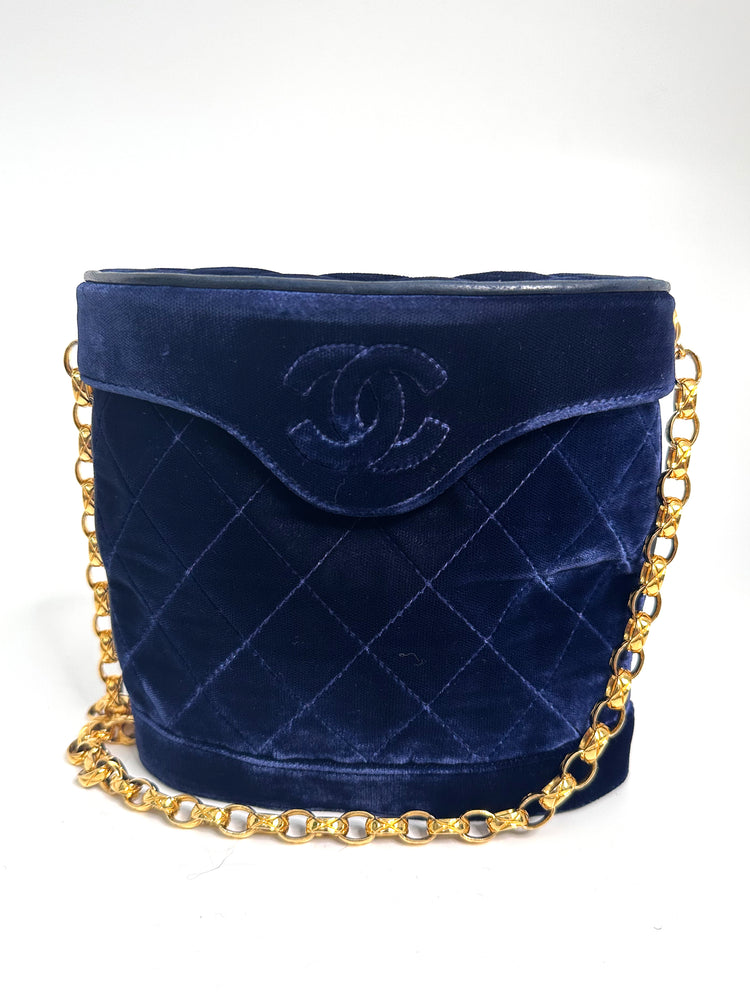 If you're looking for a designer crossbody bag, then look no further. Inspired by the binocular cases often seen at racecourses, this rare vintage pre-owned binocular bag from 1989-1991 has been crafted from quilted navy velvet and finished with a gold-toned chain. Secured using a button fastening, the flap has been embroidered with a 'CC' logo and can be opened to reveal a small zipped interior pocket, perfect for keeping all your loose items secured and organised. Wear the chain strap over the shoulder or cross-body.