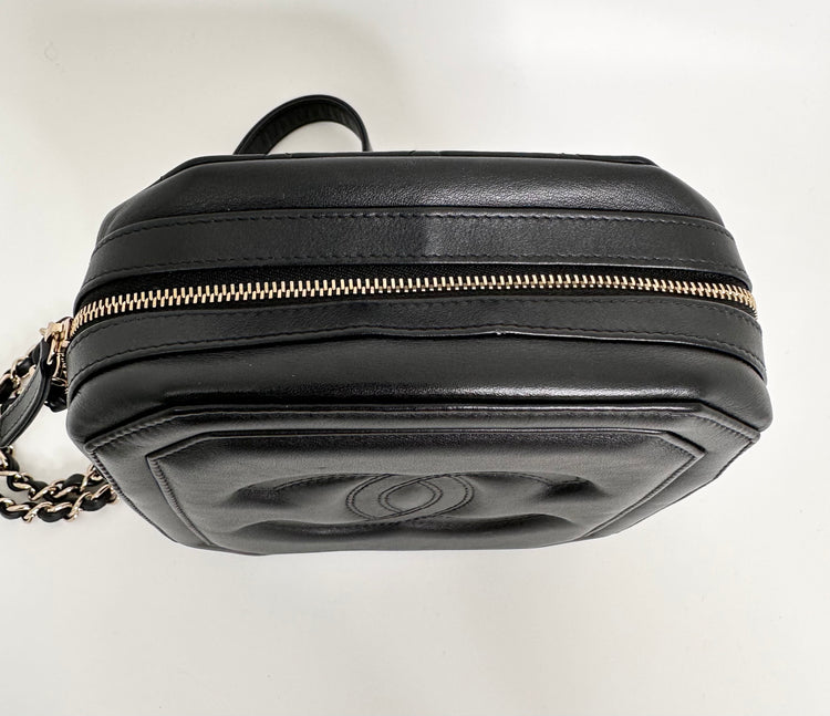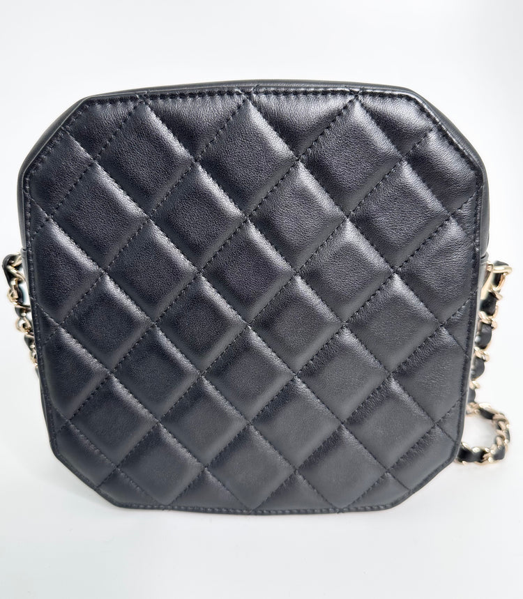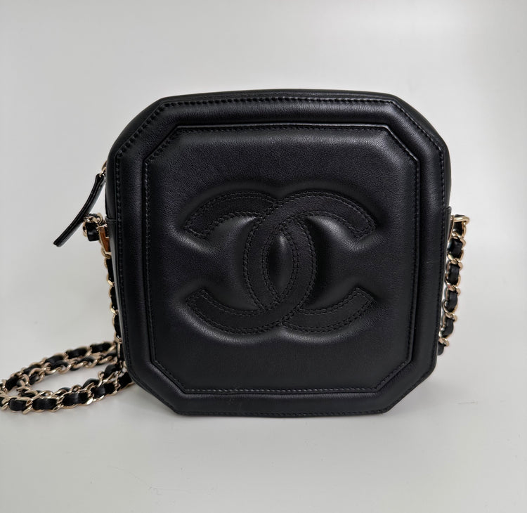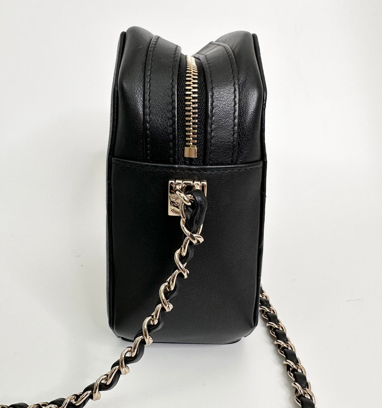 Camera bags are named for their practical, compact shape. Crafted from black lambskin, this pre-owned Chanel bag from 2021 features the brand's signature CC logo on one side and quilted detailing on the other. Wear it across the body or over your shoulder on busy days using the interwoven chain leather strap.