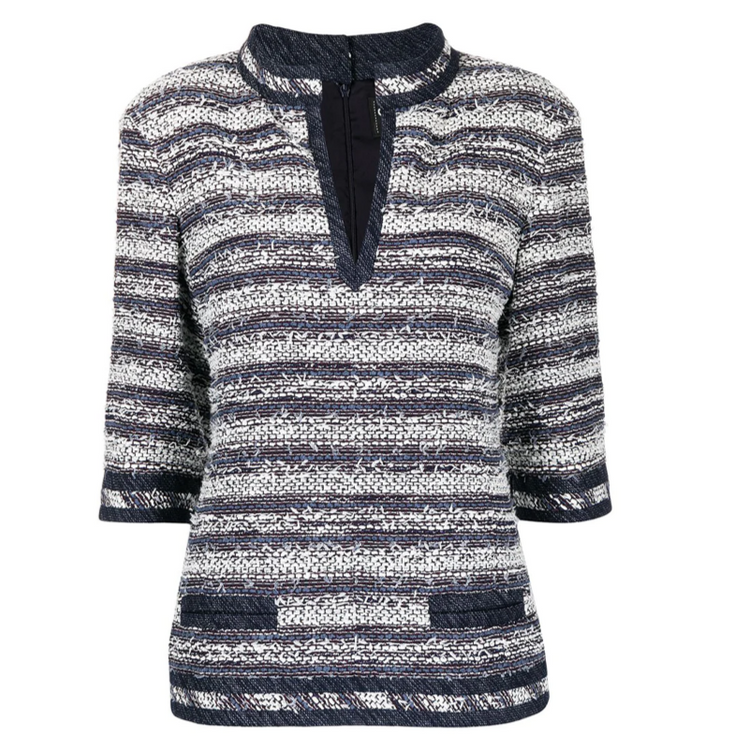 Offering a bohemian feel, this pre-owned tunic from the 2013 collection has been crafted from tweed in the tones of navy, white and burgundy. Featuring two faux frontal pockets, a CC logo back closure and 3/4 length sleeves, this unique piece has a navy metallic thread running through the striped print giving this beautiful piece a shimmering effect. Lined with silk, pair with jeans and sneakers for an effortless look.