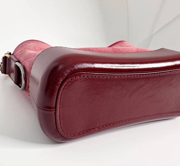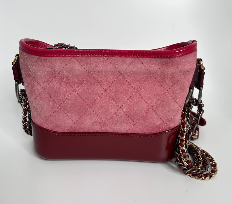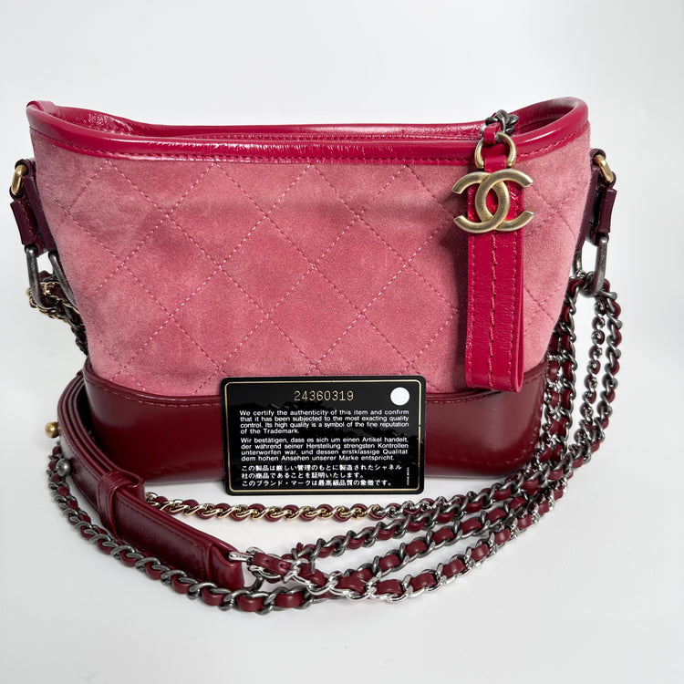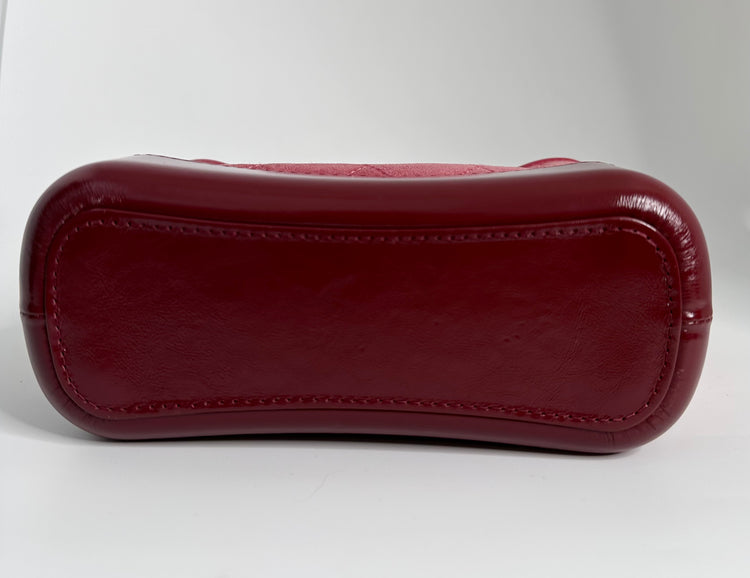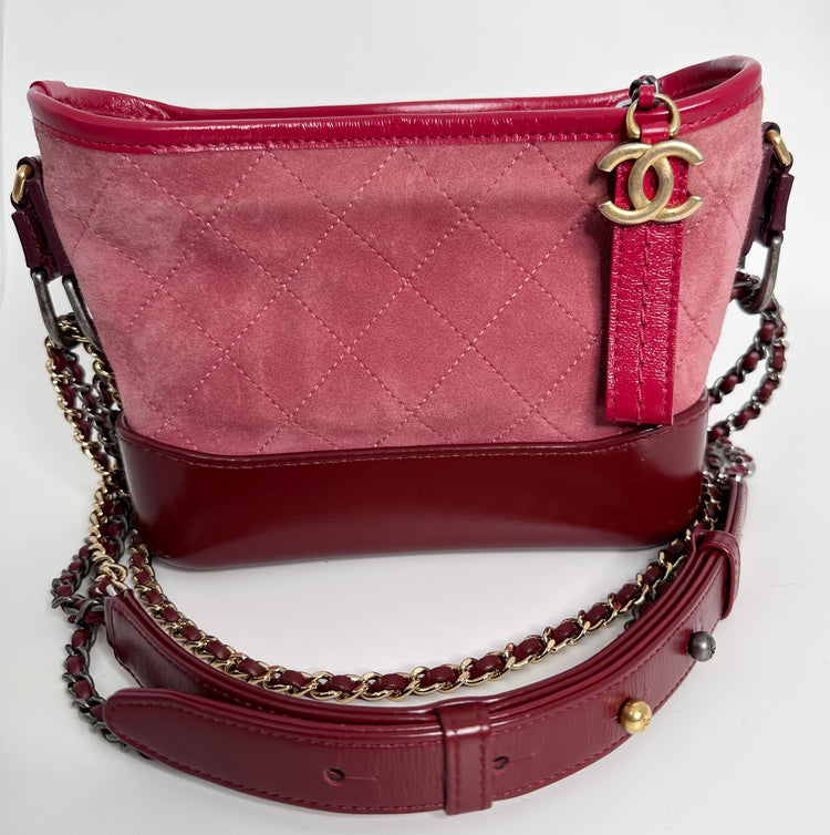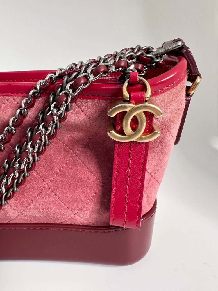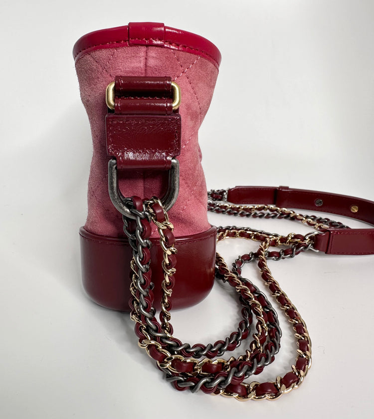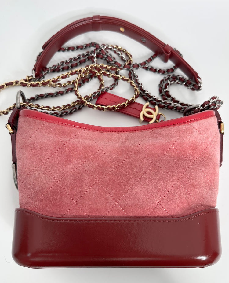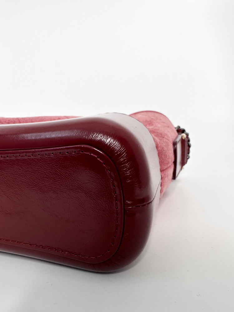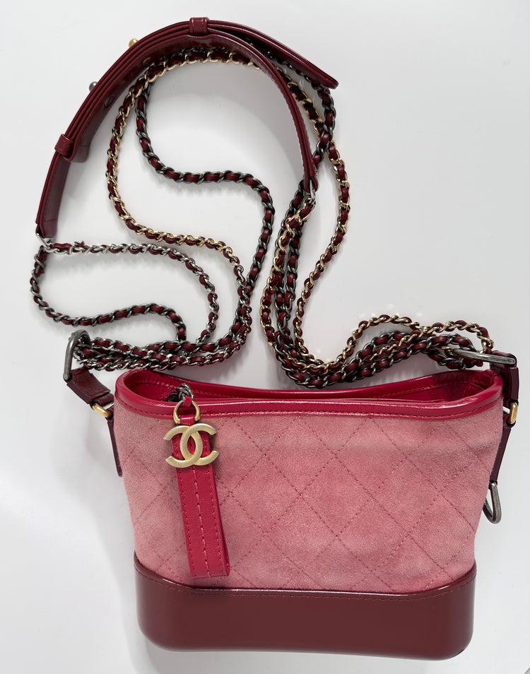 The Chanel Gabrielle bag was first introduced in 2017, and is said to take inspiration from virtual reality glasses with an effortlessly cool, contemporary style. Featuring diamond stitched suede leather in red and a matching calfskin base, this pre-owned bag opens to a spacious deep red interior with patch pockets. Perfect for holding all your daily essentials!