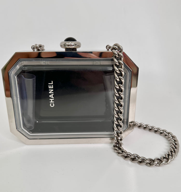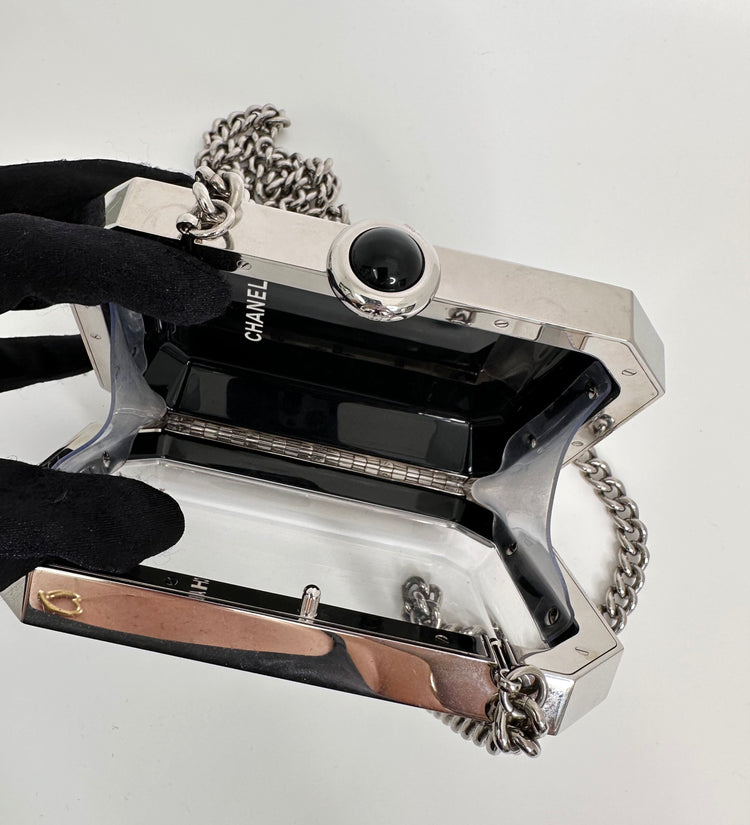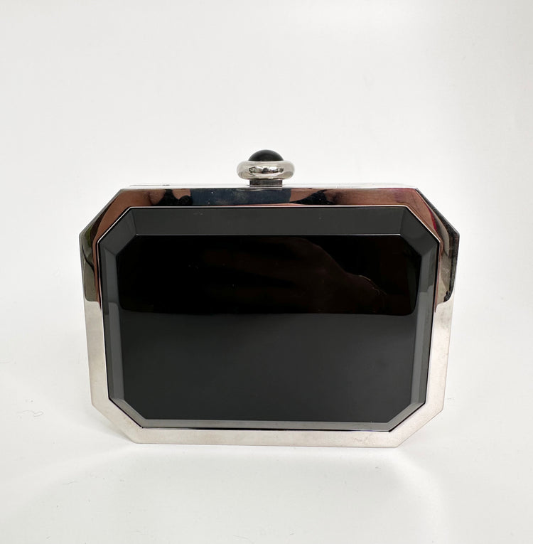 This vintage Chanel clutch with chain bag minaudière has been crafted from mirrored hardware in sleek style lines. Panelled with plexiglass, one side is glossy black and the other is transparent - you can even see a Chanel logo through the window. It's topped with a 'CC'-embossed push-clasp, and has an optional curb-chain shoulder strap. Be sure to carry the prettiest essentials when wearing this playful black mini shoulder bag - think smartphone, card holder, and a Chanel lipgloss.
