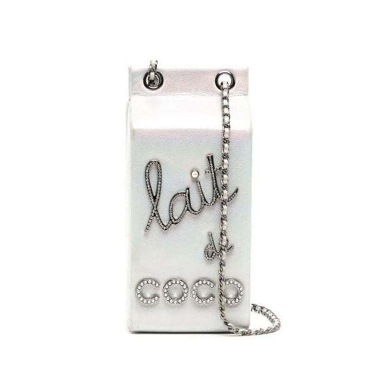Got milk? This incredibly rare and limited edition Chanel milk carton bag derives from one of Karl Lagerfeld's most infamous runways of all time, the supermarket emporium of autumn/winter 2014. Its iridescent silver leather is detailed with quilted side panels, and reads lait de Coco across its front in pearls, crystals strass and silver-tone metal. To be worn shoulder-slung from Chanel's signature leather-threaded chain strap, in white. Groceries have never looked so chic.