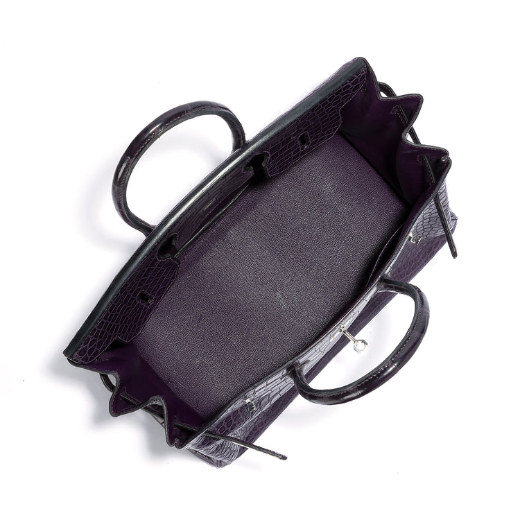 The Birkin bag remains a true statement thanks to Hermes' signature craftsmanship and exclusivity. Crafted in durable and cured Porosus Crocodile skin in an amethyst tone and matte finish, this pre-owned bag is the perfect accessory for any season or outfit. Fastened with palladium hardware this pre-owned Hermes Birkin features tonal stitching, a front flap, two straps with a centered toggle closure, and double rolled leather handles. With a smooth texture and a unique color, you won't be able to keep your hands or your eyes off of it.