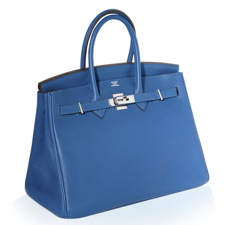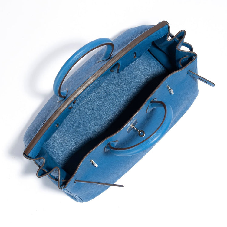 In 1984, Hermès CEO Juan-Louis Dumas boarded a flight and sat beside Jane Birkin. As she stowed away her straw handbag, the contents fell to the floor. As Birkin gathered her belongings, she explained to Dumas that she had not been able to find a leather weekend bag that she liked. It was this series of events that led Dumas to design the Birkin Bag. Almost 40 years later, the Birkin bag is world-renowned for its quality craftsmanship and intricate detailing. This jaw-dropping Hermès Birkin 35cm is no exception. Crafted from highly sought-after Epsom leather, known for its distinctive appearance, in a calming and beautiful blue colour, accented with Palladium hardware.