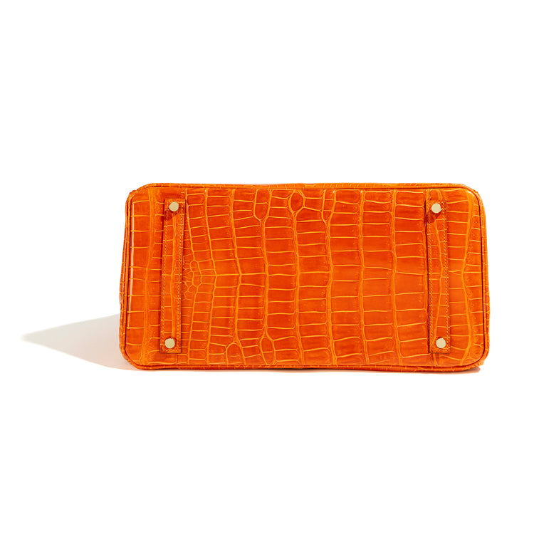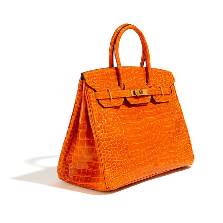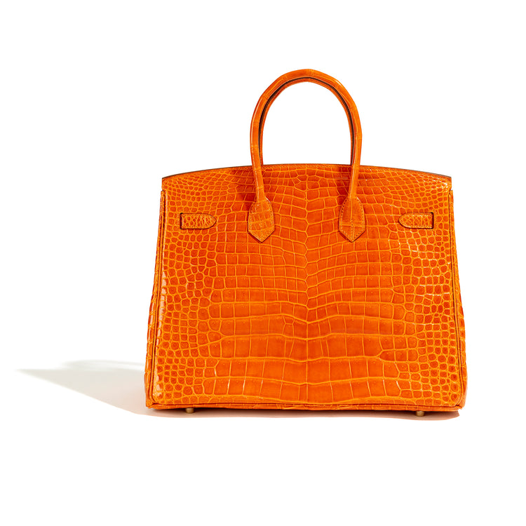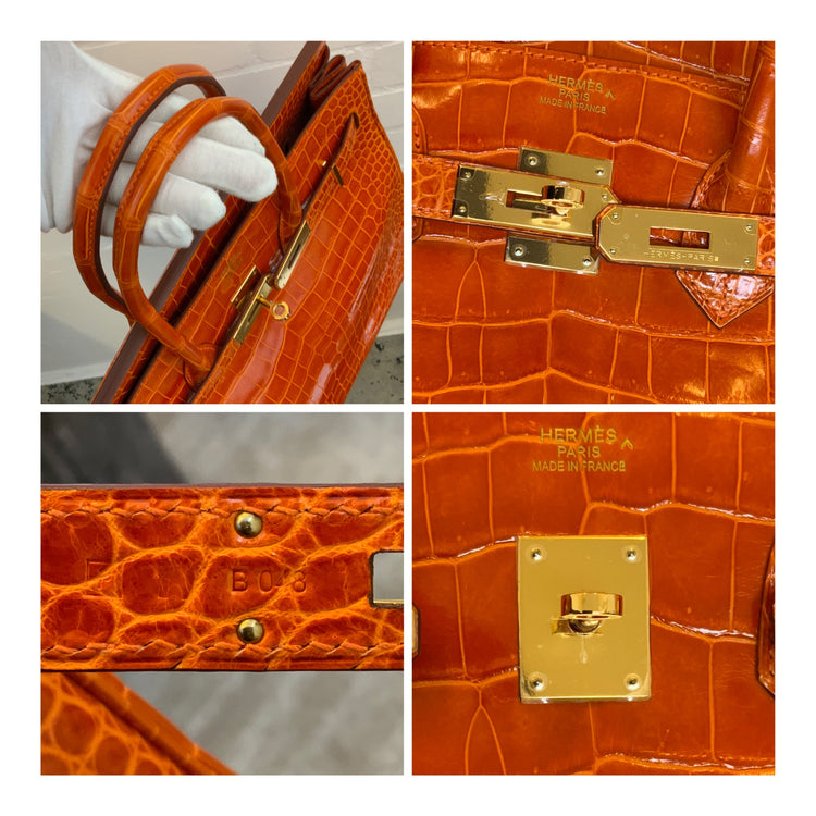 Hermès Pain D'Epice Shiny Porosus Crocodile Birkin 35 in Gold Hardware. This bag is in excellent condition and still has plastic on the hardware. Expertly crafted from the finest materials.