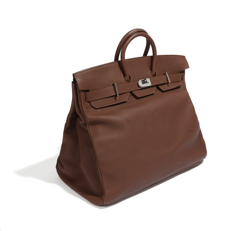 The Hermès HAC is a classic handbag that has gained worldwide recognition. The design of this bag was originally intended to carry riding equipment. The process of creating these bags is quite complex, and it takes three to four years of rigorous training for each craftsman to master it. This HAC is expertly crafted with brown Togo leather and enhanced with palladium hardware. It is spacious and perfect for travel. The bag also comes equipped with its original dust bag. This bag shows some signs of use, including a small mark on the front.