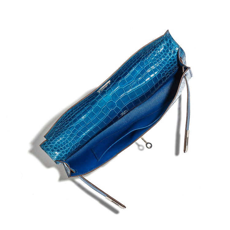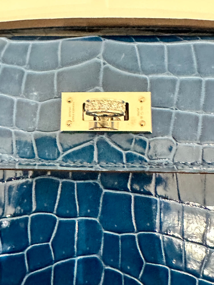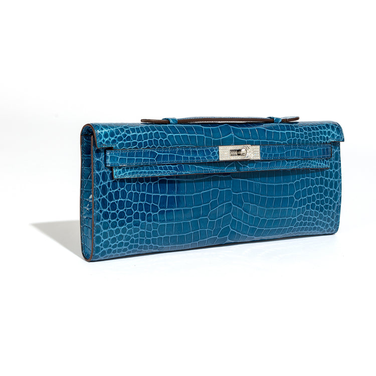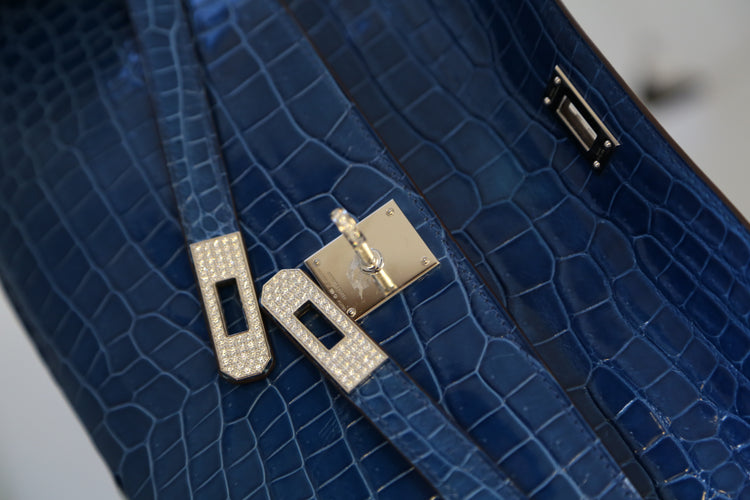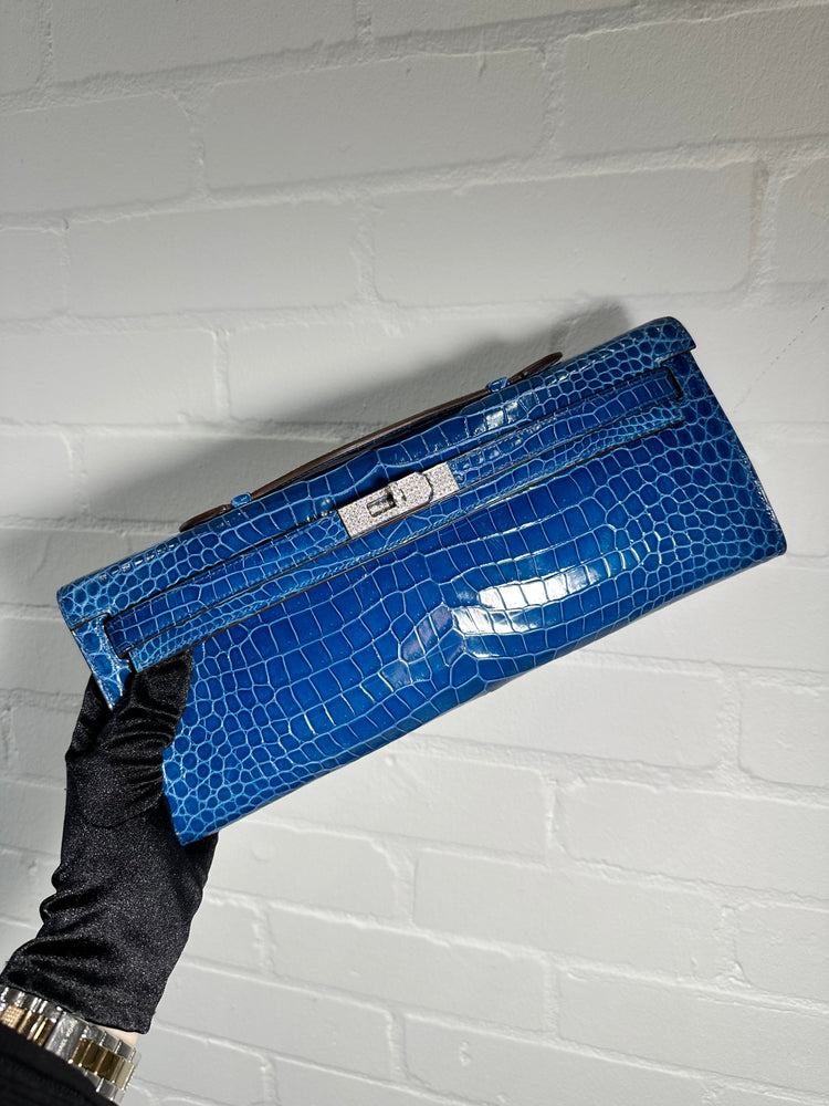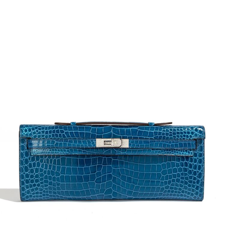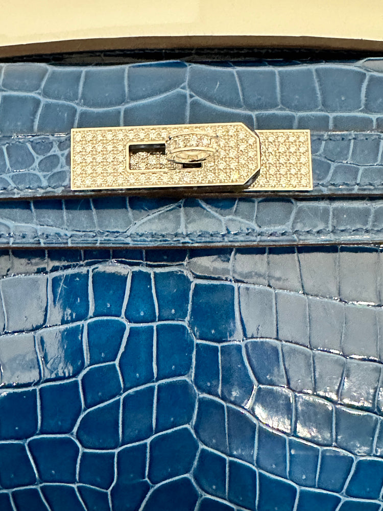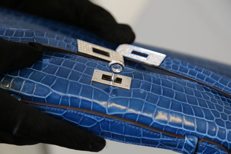 This Kelly Cut with diamonds is an extremely rare collector's item that exudes luxury. It is made from exquisite leather and features diamond-encrusted 18-karat white gold hardware. The diamonds are set into the cadena lock and turret, transforming this classic Kelly Cut into an extravagant statement piece. The bag is in good condition, exhibiting a few scratches on the front panel and a few hairlines in the hardware and on the back. Please refer to the images enclosed.