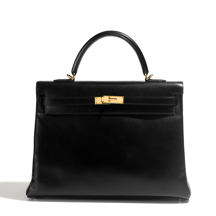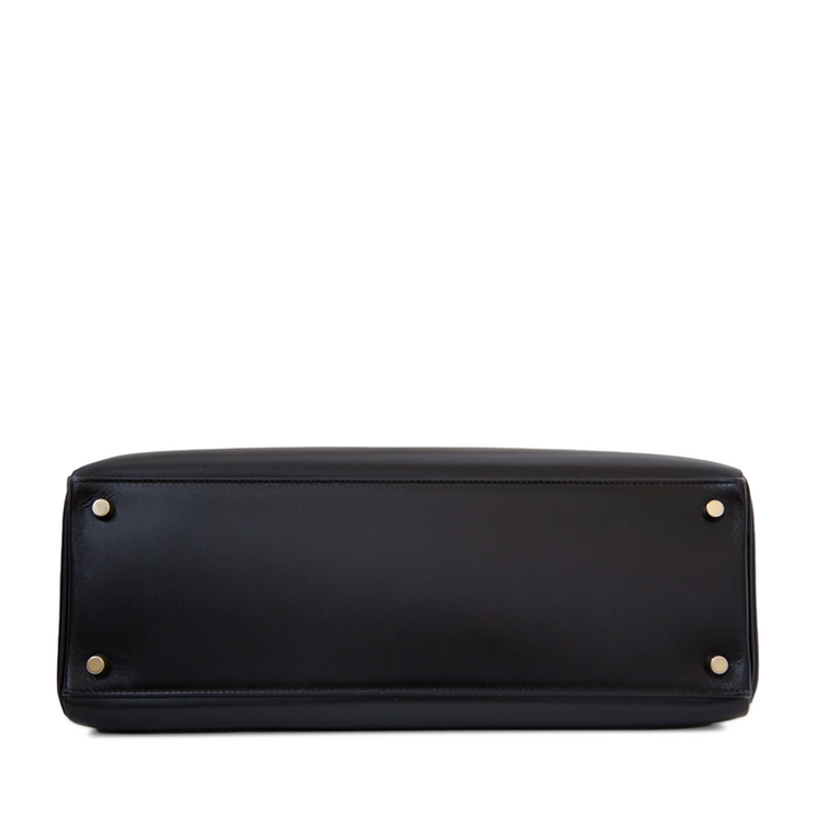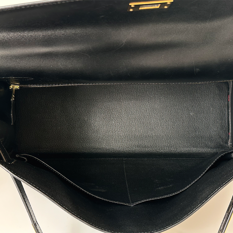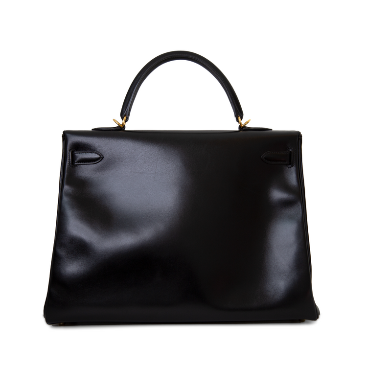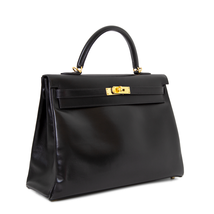 This 35cm Black Box GHW Kelly bag is an elegant and timeless design, crafted from smooth black box leather and polished gold hardware. This stately piece was crafted in 2008, creating an alluring combination of vintage charm and modern luxury. A timeless accessory for stylish and sophisticated outings.