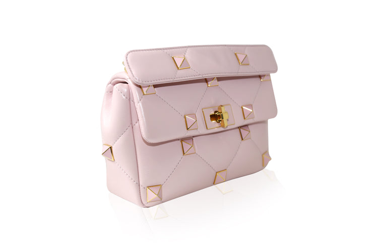 Valentino Garavani embraces a timeless colour palette with this ''Rose Quartz'' Roman Stud Medium shoulder bag. The lines of the pyramid studs are elegantly mirrored by diamond-quilted Nappa leather. Make yours a glamorous plus-one for evenings out.