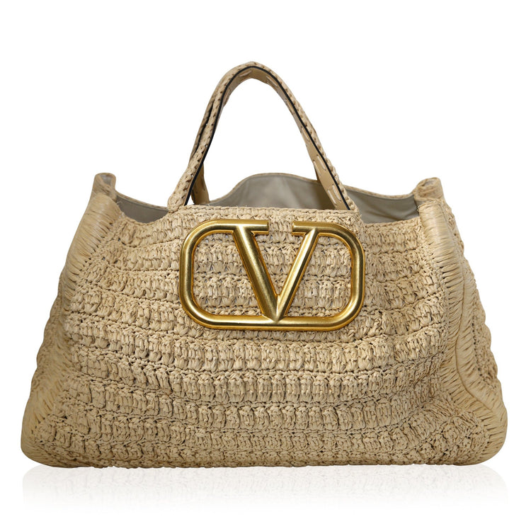 Crafted from naturally woven raffia, this stunning 'In It' bag from Valentino showcases the brand's tasteful aesthetic and meticulous design. Featuring a lovely hue and the brand logo at the front, it also has two top handles and comes with a dust bag.