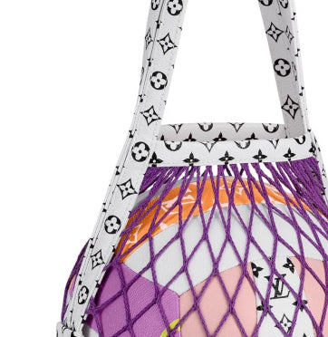 This design incorporates both larger and miniature LV monogram patterns for a dynamic look. It comes with a convenient net bag for easy transportation. The purple mesh body is secured to a monogram leather handle in black and white, providing a durable and stylish carrying option.
