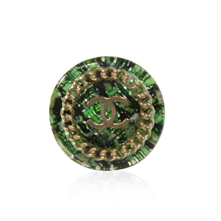 The Green Tweed Ring by Chanel is a stylish accessory crafted with high-quality materials. The subtle green tweed design adds a touch of sophistication to any outfit. Made by Chanel, this ring exudes elegance and luxury. Elevate your fashion game with this timeless and rare piece.