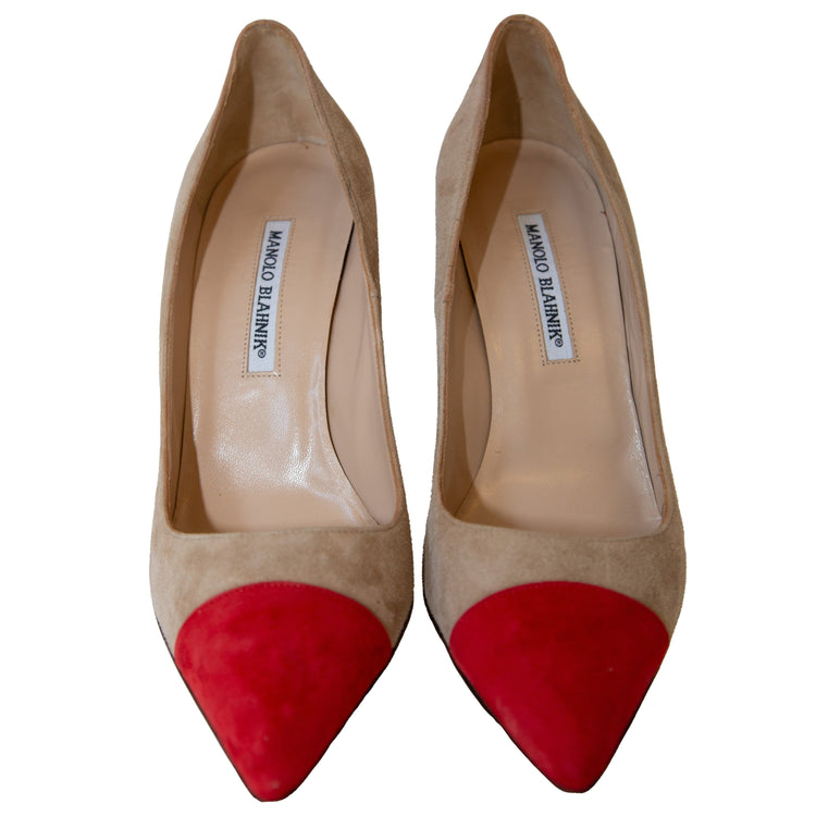 Expertly crafted by legendary shoe designer Manolo Blahnik, these beige and red pumps showcase a timeless blend of luxury and style. With a pointed toe design, these pumps are perfect for any occasion and will elevate any outfit to new heights.