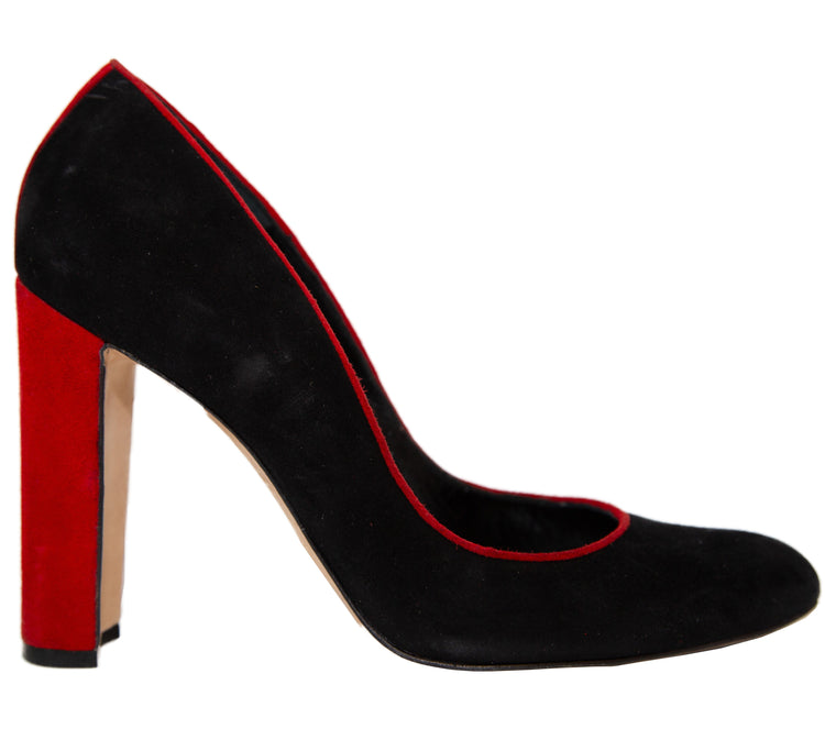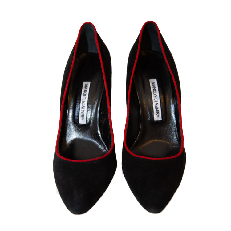 Expertly crafted by Manolo Blahnik, these black and red suede block heels are a timeless addition to any wardrobe. With their sleek design and comfortable block heel, these shoes are perfect for any occasion. Elevate your style and confidence with these luxurious heels.
