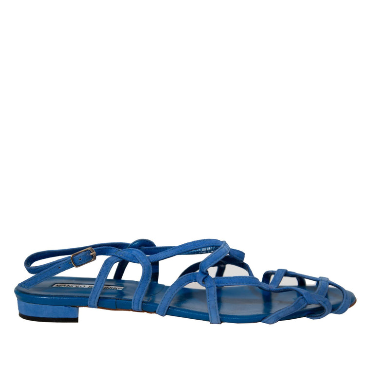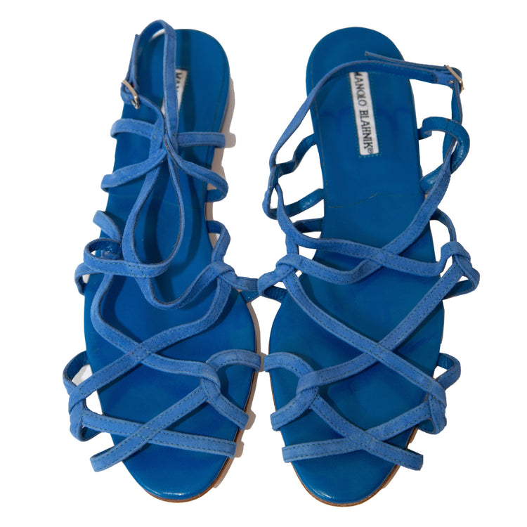 These Manolo Blahnik blue sandals boast a stylish design with a comfortable fit. Made with high-quality materials and expert craftsmanship, these sandals are perfect for any occasion. Elevate your style and step into luxury with Manolo Blahnik.