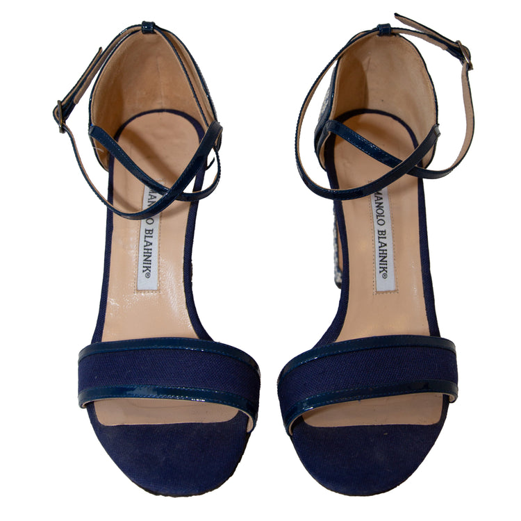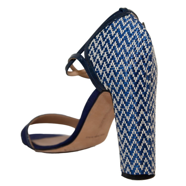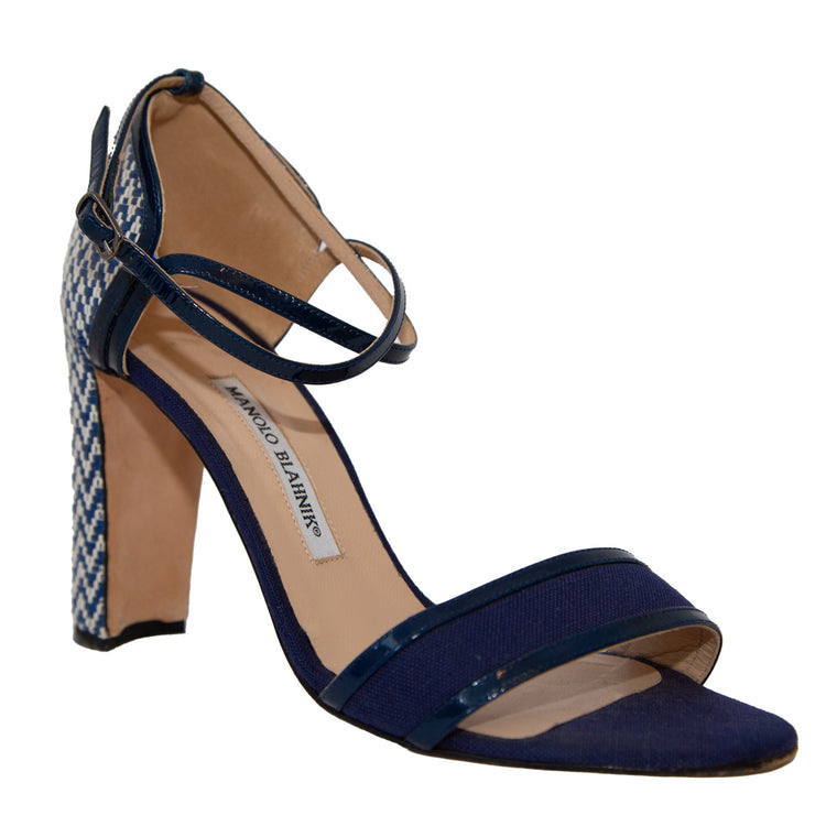 Expertly crafted by Manolo Blahnik, these iconic zigzag block heels feature a stunning blue and white design. With superior materials and meticulous attention to detail, these heels will elevate any outfit with a touch of elegance and sophistication. Perfect for any occasion, these heels are a must-have.
