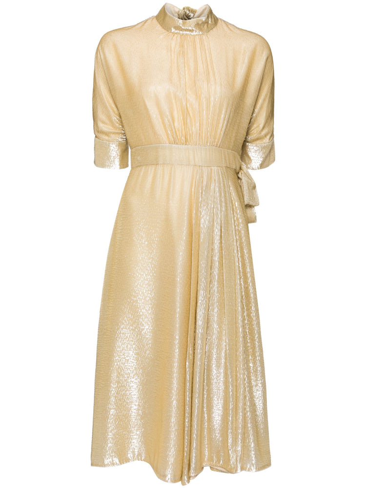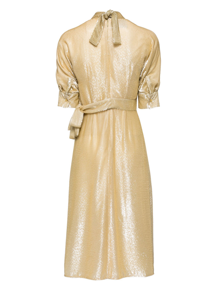 This Prada mid-length shiny gold dress is expertly crafted to provide a sleek and sophisticated look. Made with high-quality materials, it boasts a shiny finish that adds a touch of glamour. With its mid-length design, this dress is versatile and perfect for any occasion. A must-have in any stylish wardrobe.