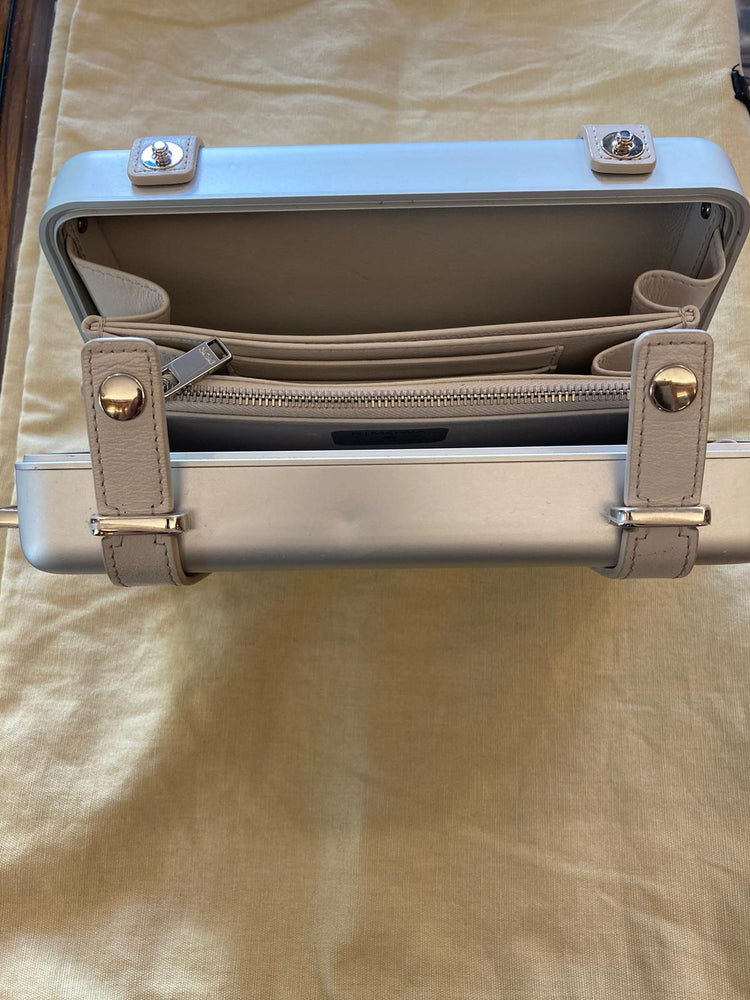 Expertly crafted and limited edition, the Dior x Rimowa Clutch is a statement piece that showcases a collaboration between two renowned brands. Made with the highest quality materials, this silver bag from the collection exudes luxury and style. Perfect for any occasion, it's a must-have for fashion-forward individuals.