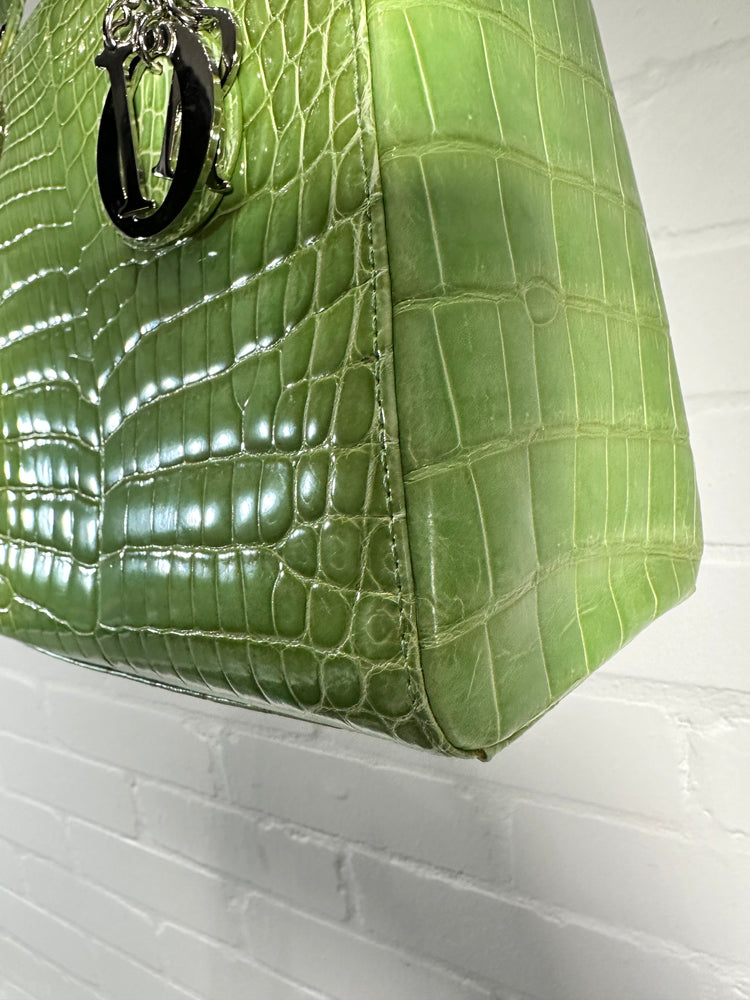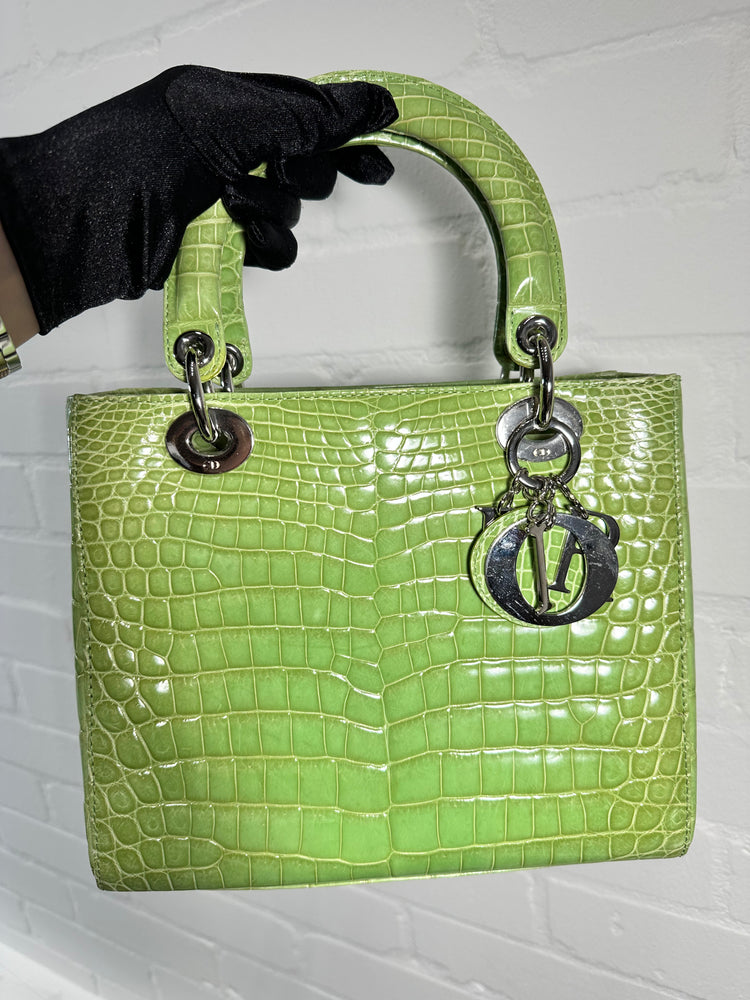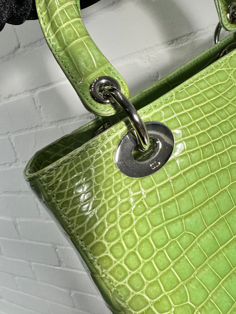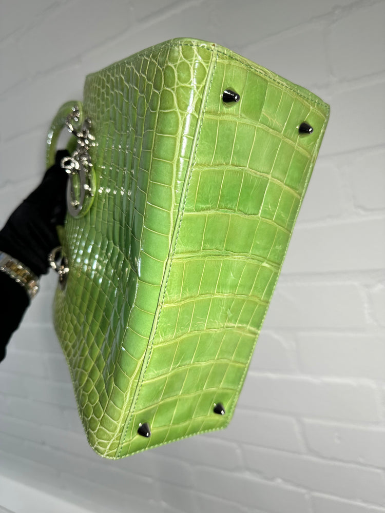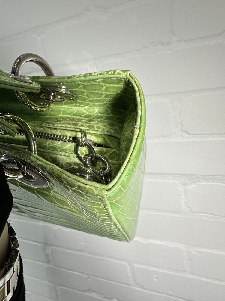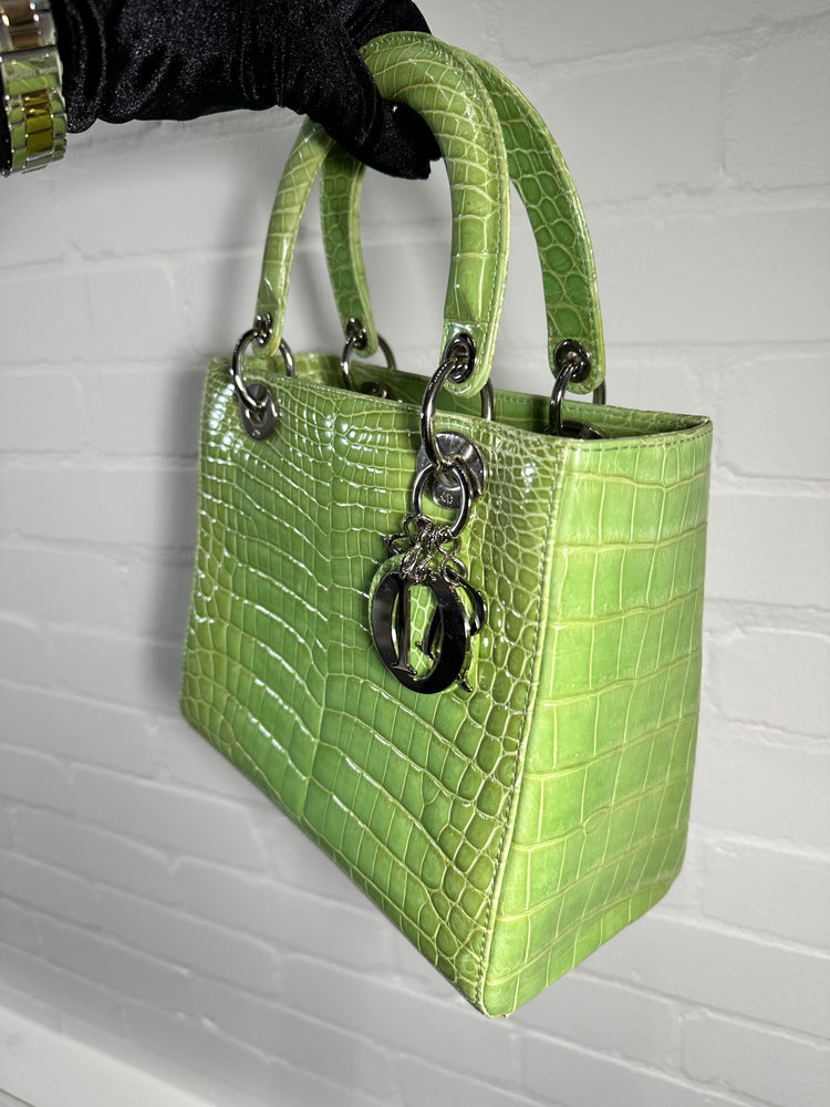 Limited edition Lady Dior handbag in green with silver hardware. This handbag is designed with a single compartment and an interior zipper pocket, ensuring your belongings stay secure and organized while you travel in style. The double-structured handle adds a touch of chic to this timeless accessory. Includes original dust-bag and authenticity card.