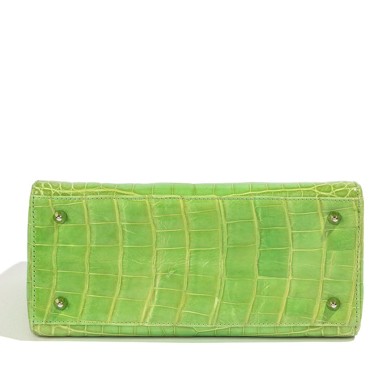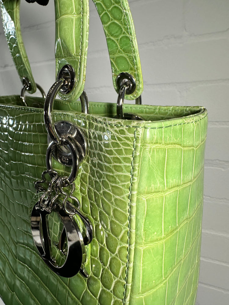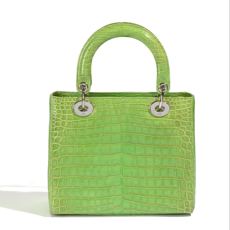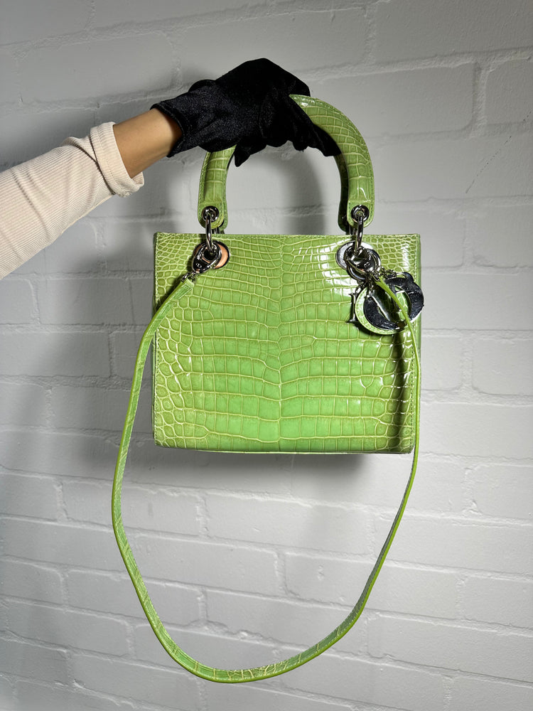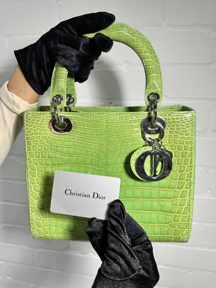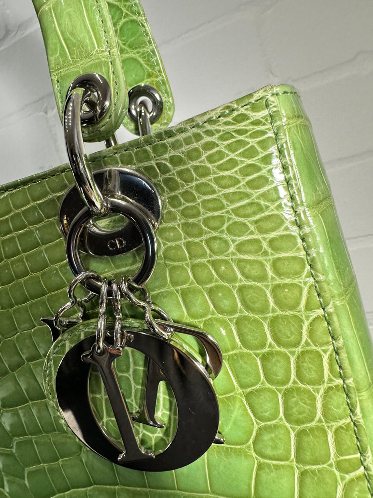 Limited edition Lady Dior handbag in green with silver hardware. This handbag is designed with a single compartment and an interior zipper pocket, ensuring your belongings stay secure and organized while you travel in style. The double-structured handle adds a touch of chic to this timeless accessory. Includes original dust-bag and authenticity card.