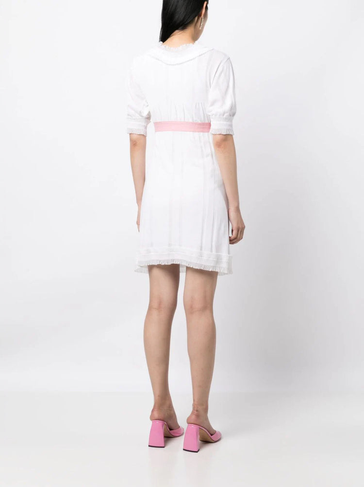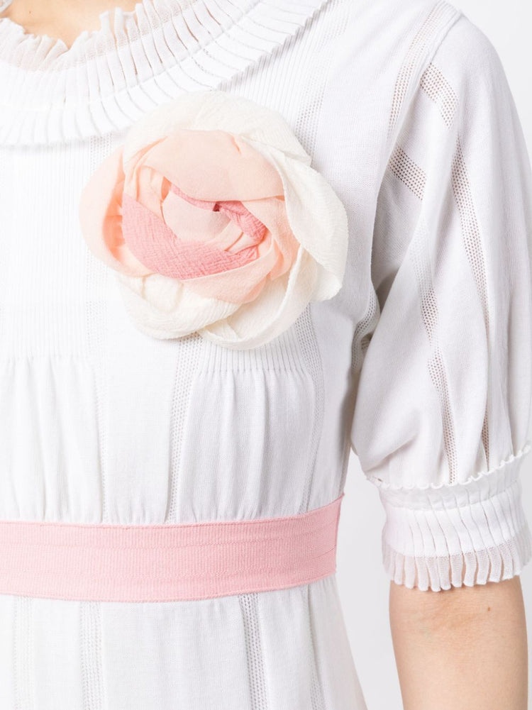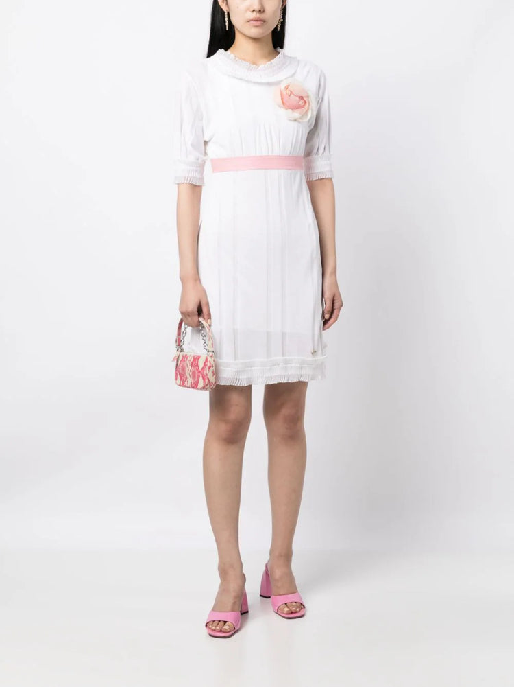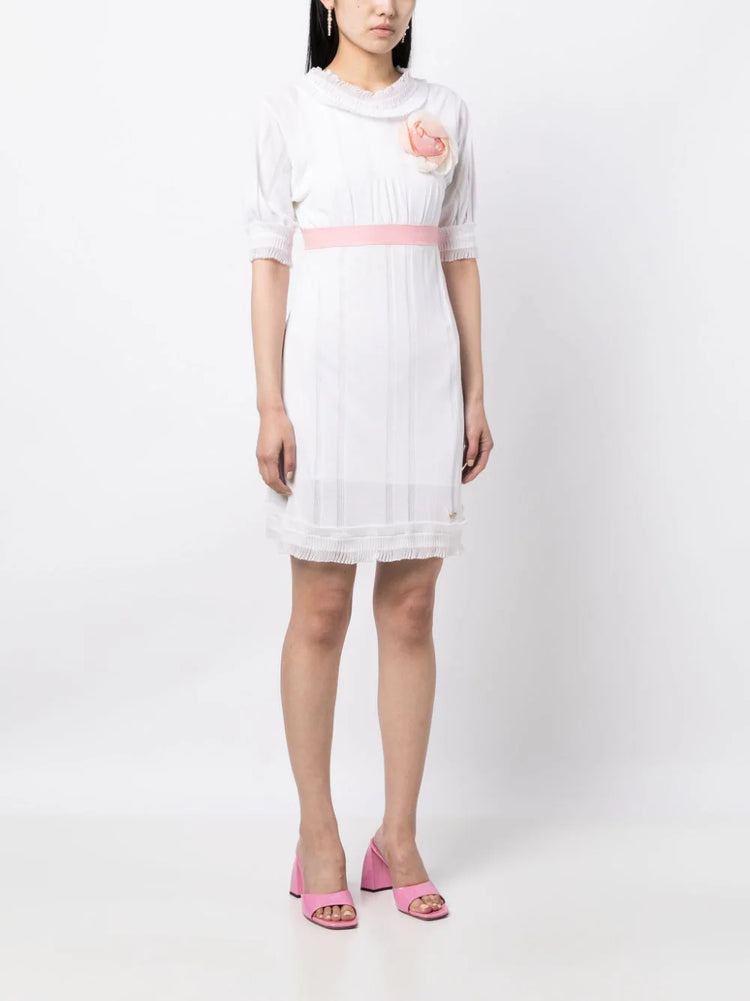 This Camelia Babydoll Dress from CHANEL is perfect for dressing up any look. Crafted from a cotton blend of tonal-pink fabrics, it's highlighted by layers of texture and a signature Camellia flower at the centre. Its pleated trims and waist belt-like band give a flattering silhouette, making it an elegant addition to your wardrobe.