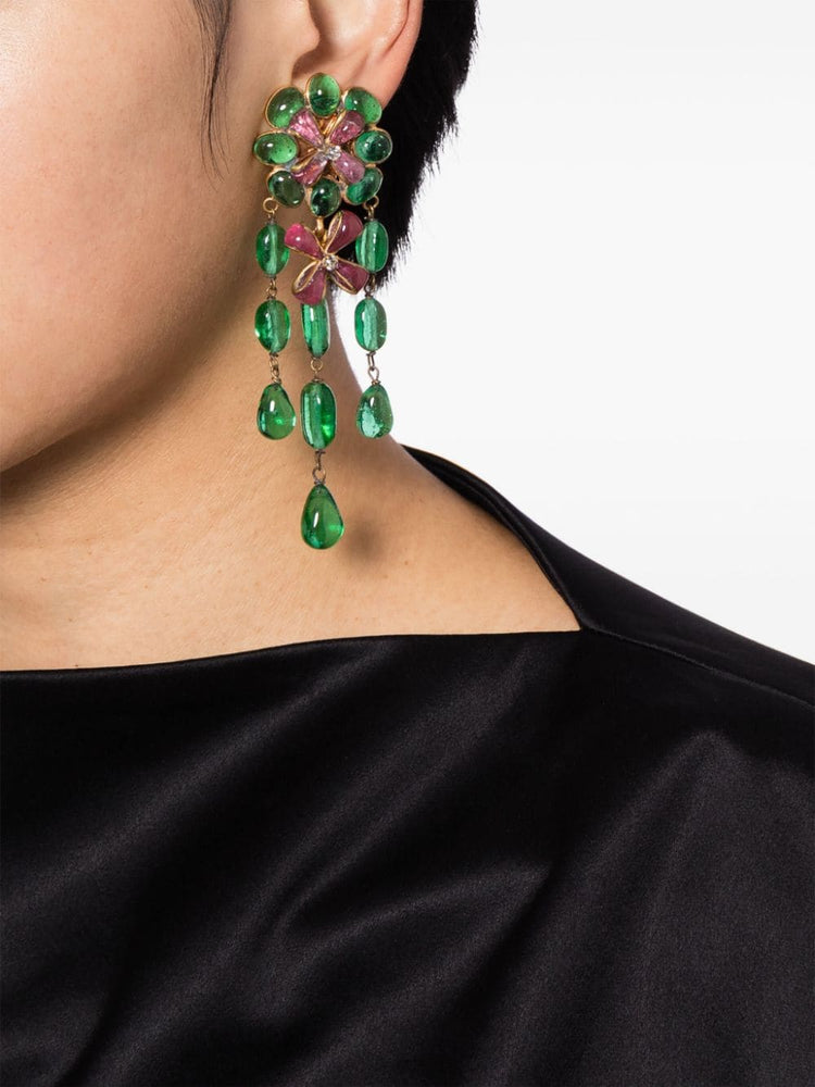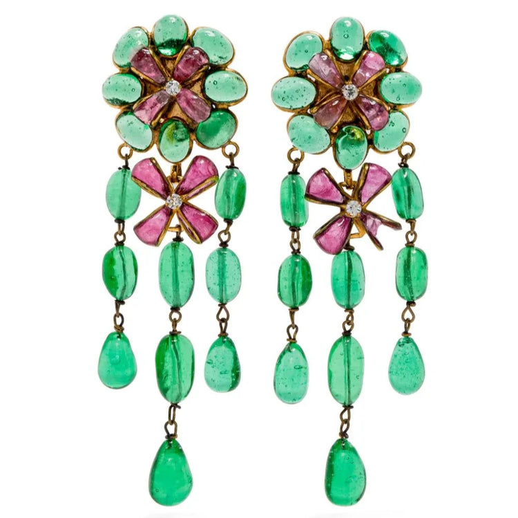 Crafted 1993 for Chanel's Spring Summer collection, these exquisite pendant earrings feature the iconic Gripoix glass and dazzling rhinestones.