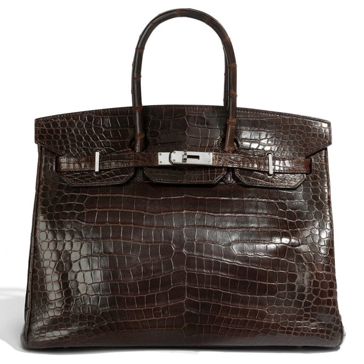 Elevate your style with the timeless elegance of the Hermès Birkin 35 in Marron crocodile leather. This exquisite piece, handcrafted in 2008, features palladium hardware and shows only subtle signs of wear. A luxurious and versatile addition to any outfit.