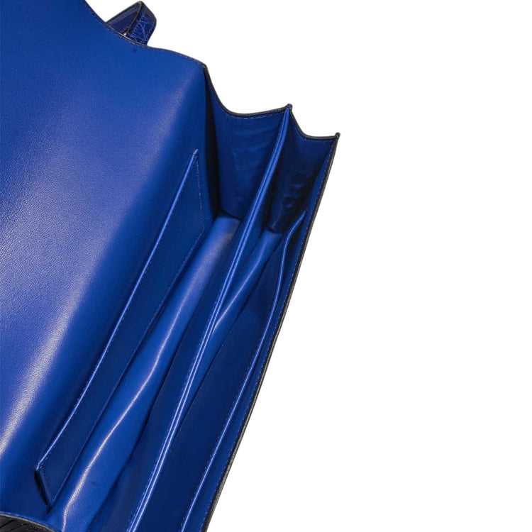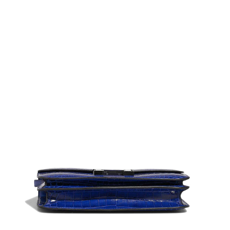 This 25cm Constance Elan shoulder bag from Hermès was meticulously crafted in France from a highly precious exotic in an electric shade of blue. Offset with silver-tone palladium-plated hardware, its slender body is adorned with the brand's signature "H" snap-lock fastening, a rear pocket and an adjustable crossbody shoulder strap. The blue leather-lined interior is split into two compartments and opens to reveal an open slip pocket and concealed front centre logo stamp.