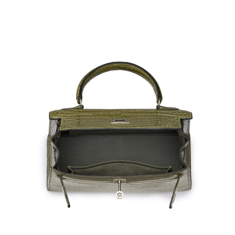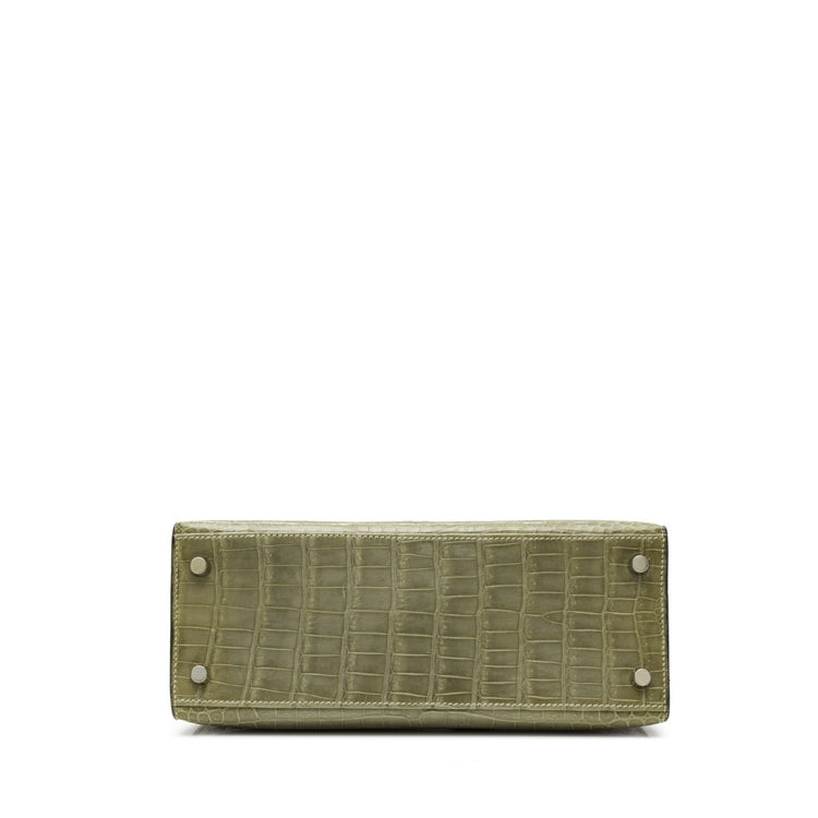 Embrace luxury with our 1999 Kelly 25 Sellier Exotic Vert Jasmine. Featuring a shiny Vert Jasmine Porosus Crocodile exterior, this handbag exudes both style and sophistication. The rare Sellier construction from 1999 adds a unique touch to this iconic Kelly 25 design. Make a statement with this one-of-a-kind fashion piece.