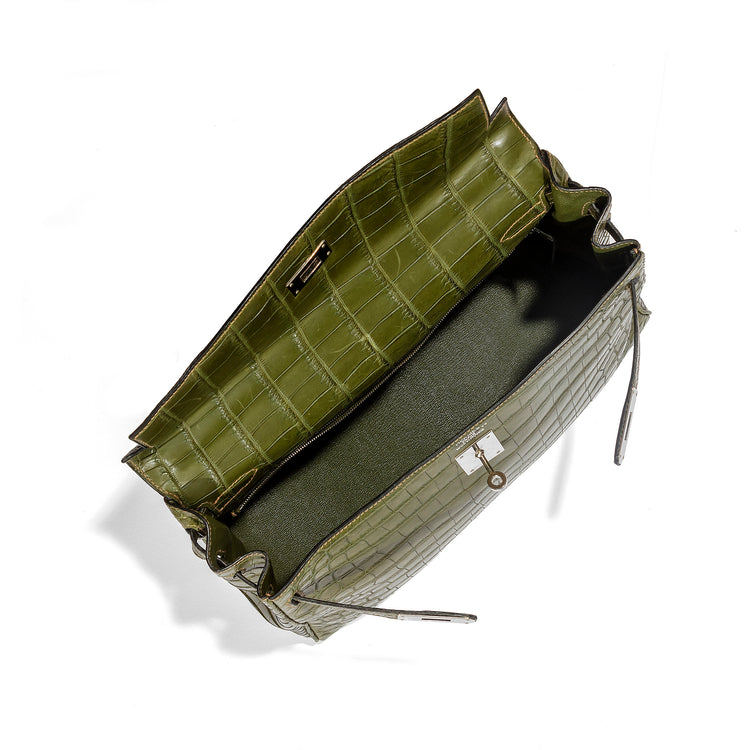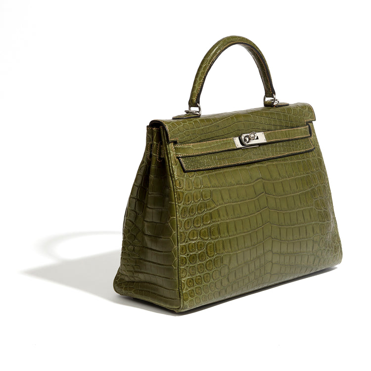 One of the most sought-after Hermès styles, this pre-owned Kelly 35 Green Niloticus bag has been crafted from khaki green crocodile leather. A true testament to the quality of the house's craftsmanship.