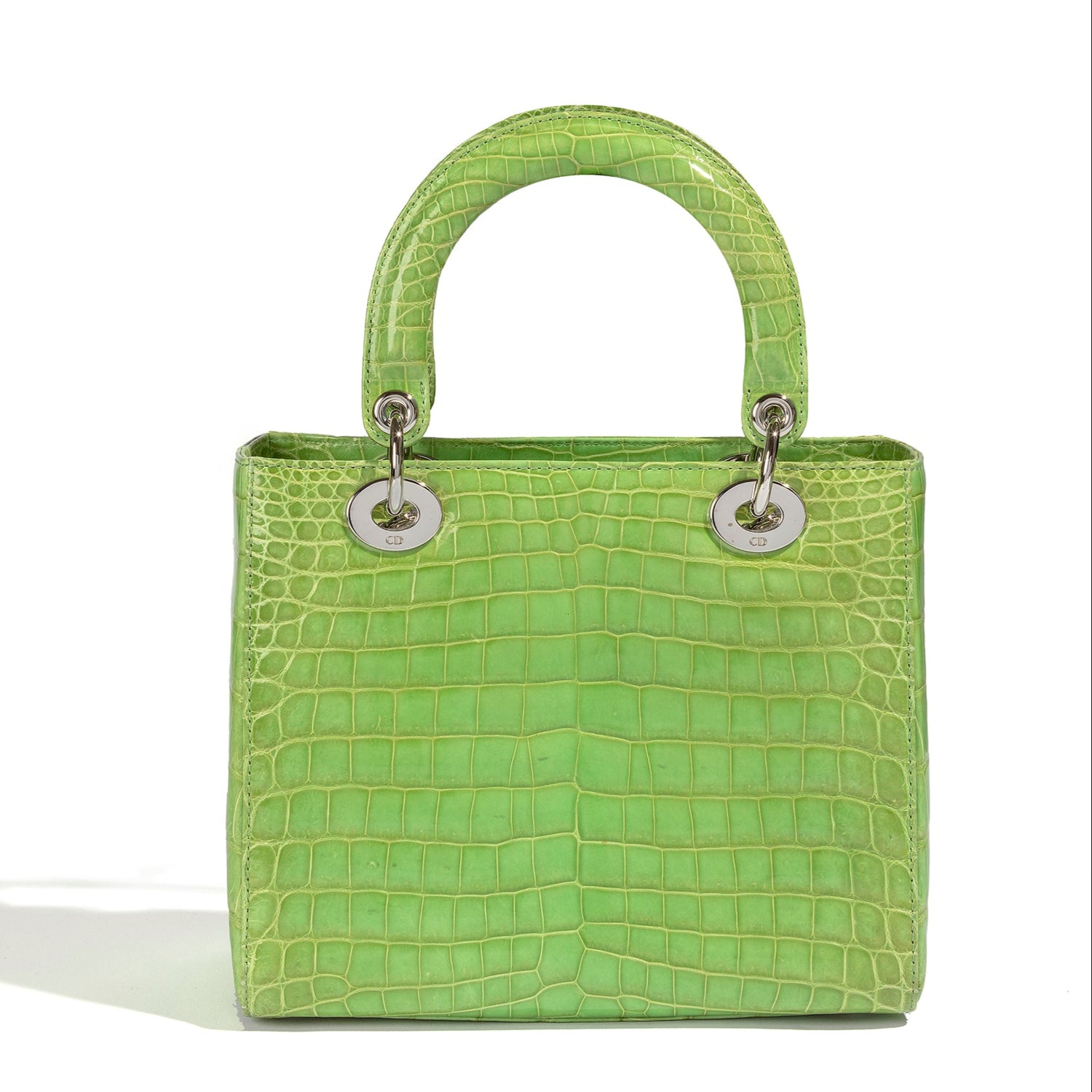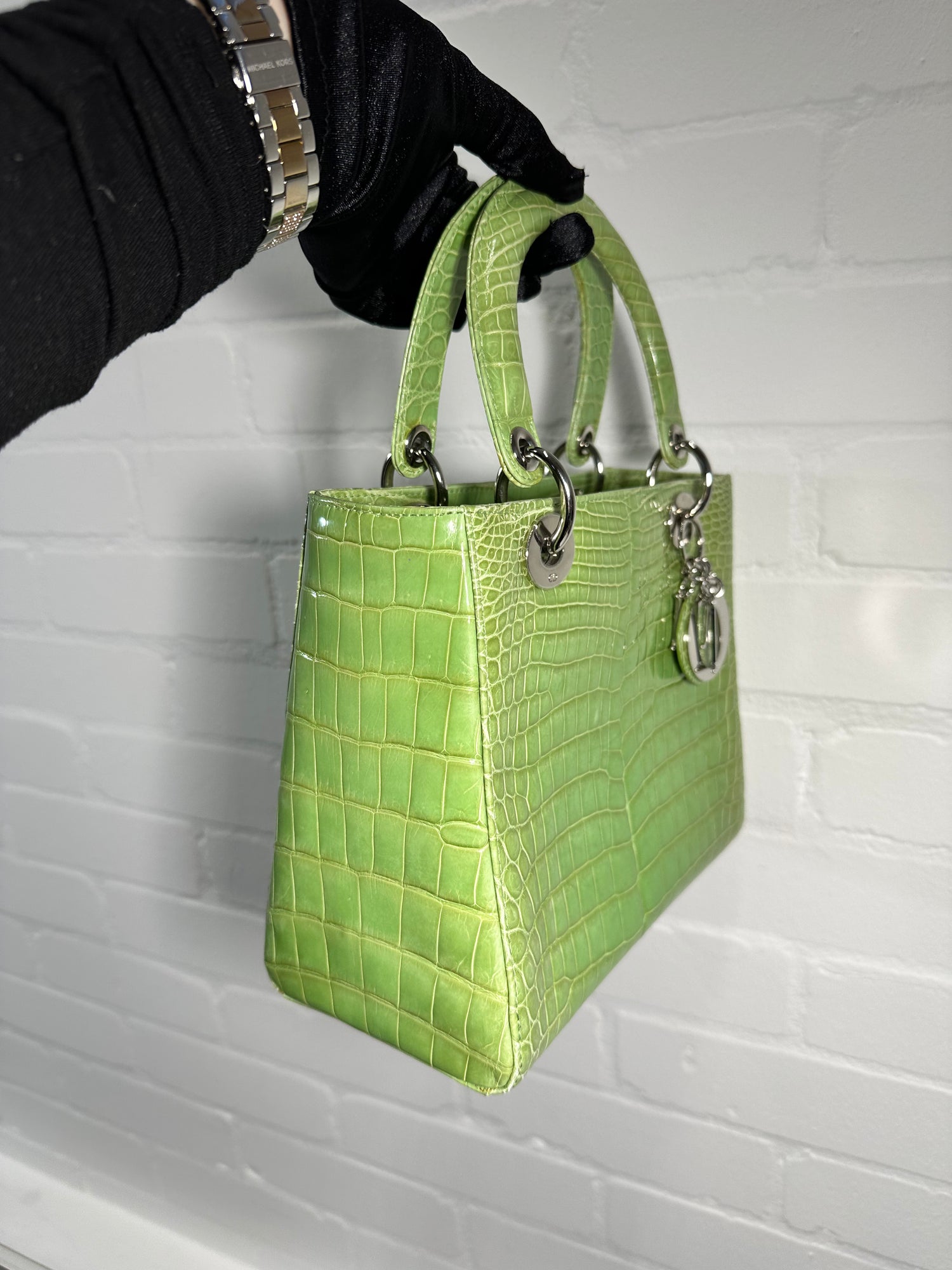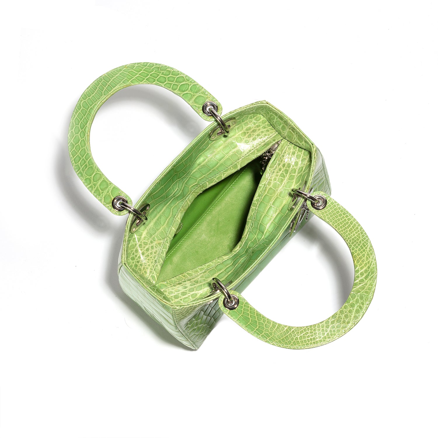 Limited edition Lady Dior handbag in green with silver hardware. This handbag is designed with a single compartment and an interior zipper pocket, ensuring your belongings stay secure and organized while you travel in style. The double-structured handle adds a touch of chic to this timeless accessory. Includes original dust-bag and authenticity card.