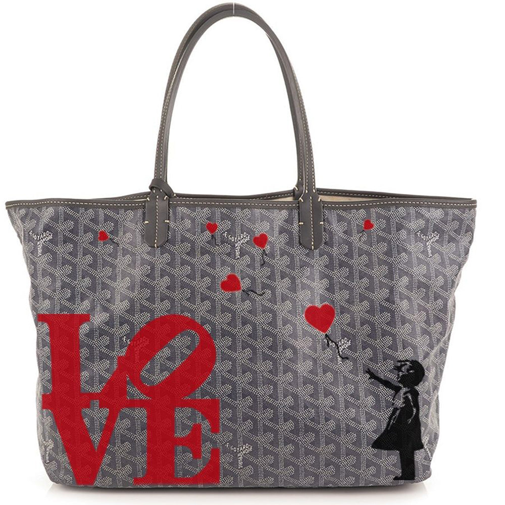 Crafted from Goyardine Canvas, a colored textile made from cotton, linen, and hemp, this grey monogram St Louis tote Bag is adorned with a design inspired by Banksy, Robert Indiana, and love itself and especially hand-painted as a part of Rewind Vintage's Emotional Baggage collection. Featuring an open-top design, two top handles, a spacious internal compartment lined in a contrasting ecru-colored canvas, and a matching pouch, this bag has been coated for durability, which gives it a leather-like look.